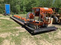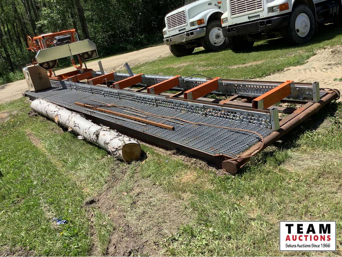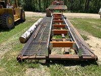 23 HP Vanguard twin cylinder engine, mounted on custom 20' rig mat skid, can cut logs 31" in diameter, 20' long, boards up to 24" wide, new box of saw blades