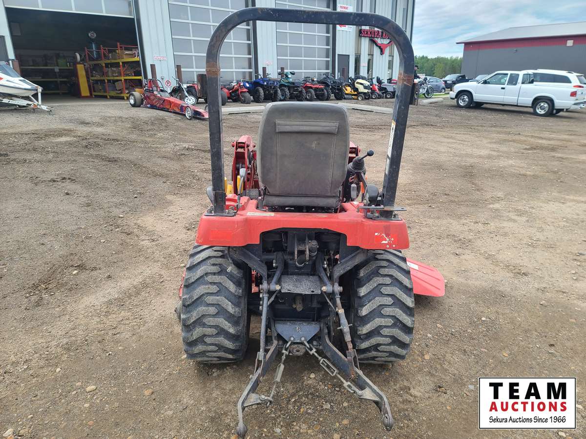 DL 100 loader, MF2325 mower, 4 ft bucket, 540 pto, hydrostatic transmission, 3 pt hitch, 18x8.5-10 front tires, 26x12.00-12 rear tires