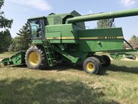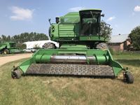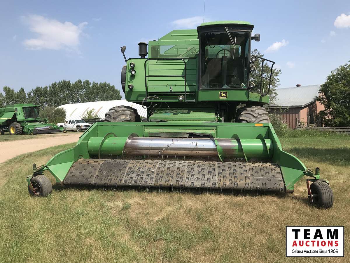 c/w John Deere 214 pickup header, hydro straw chopper, air foil, top sieve, long unload auger