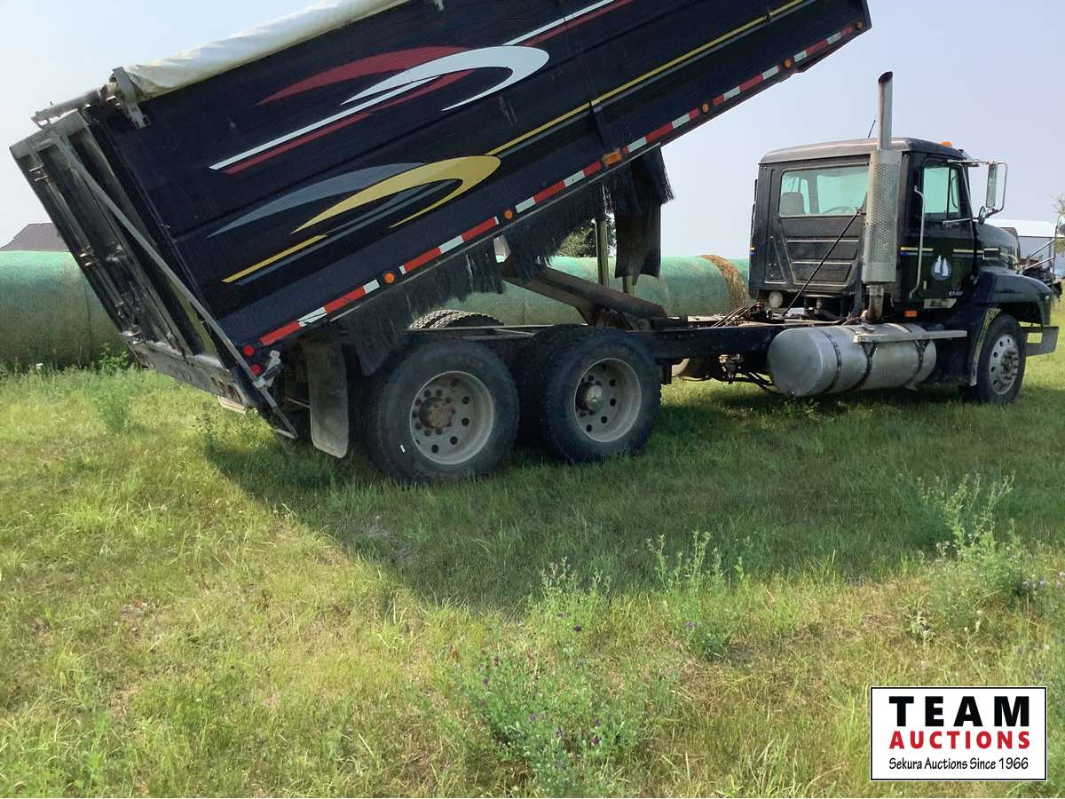 Mack EZ 427, 12.0 L, 427 hp, 6 cylinder, diesel, engine brake, Maxitorque 18 speed transmission, air ride suspension, air ride cab, AC, 20 ft steel box, hydraulic silage end gate, roll tarp, Nordic scissor hoist, air over hydraulic cab controls, all aluminum wheels, 11R24.5 tires