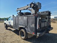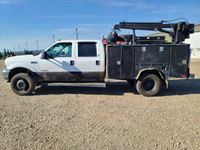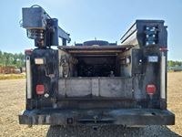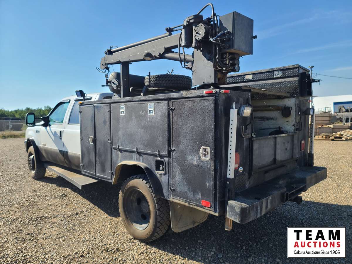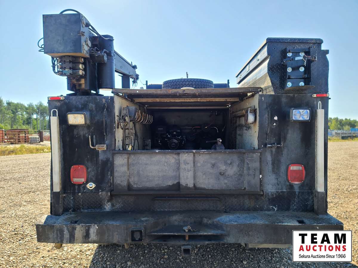 Power Stroke V8 diesel engine, automatic transmission, cloth interior, Auto Crane 3203 W/3200 lb lift c/w controller, 13 HP air compressor, locking tool boxes, 245/70R19.5 tires