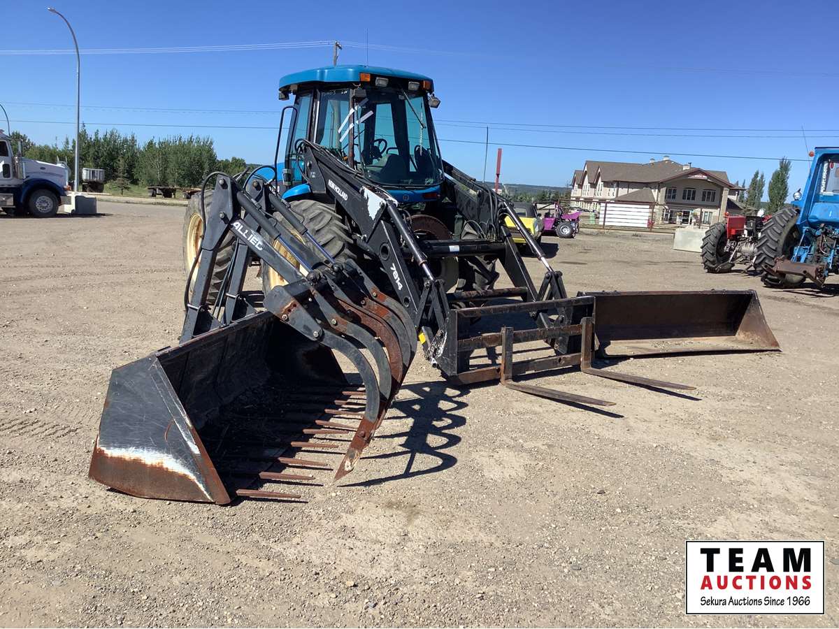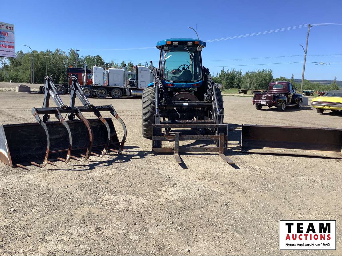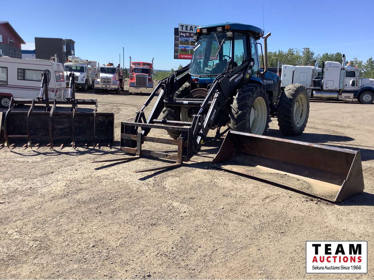New Holland 7614 loader, Q/A dirt bucket, pallet forks, tooth bucket with grapple all sell with tractor, Cab, 3 PT hitch on cab end, triple hydraulics, AC radio, heater, only have 1000 PTO shaft on cab end, no 540 shaft, parts and service manuals, 16.9 x 38 tires