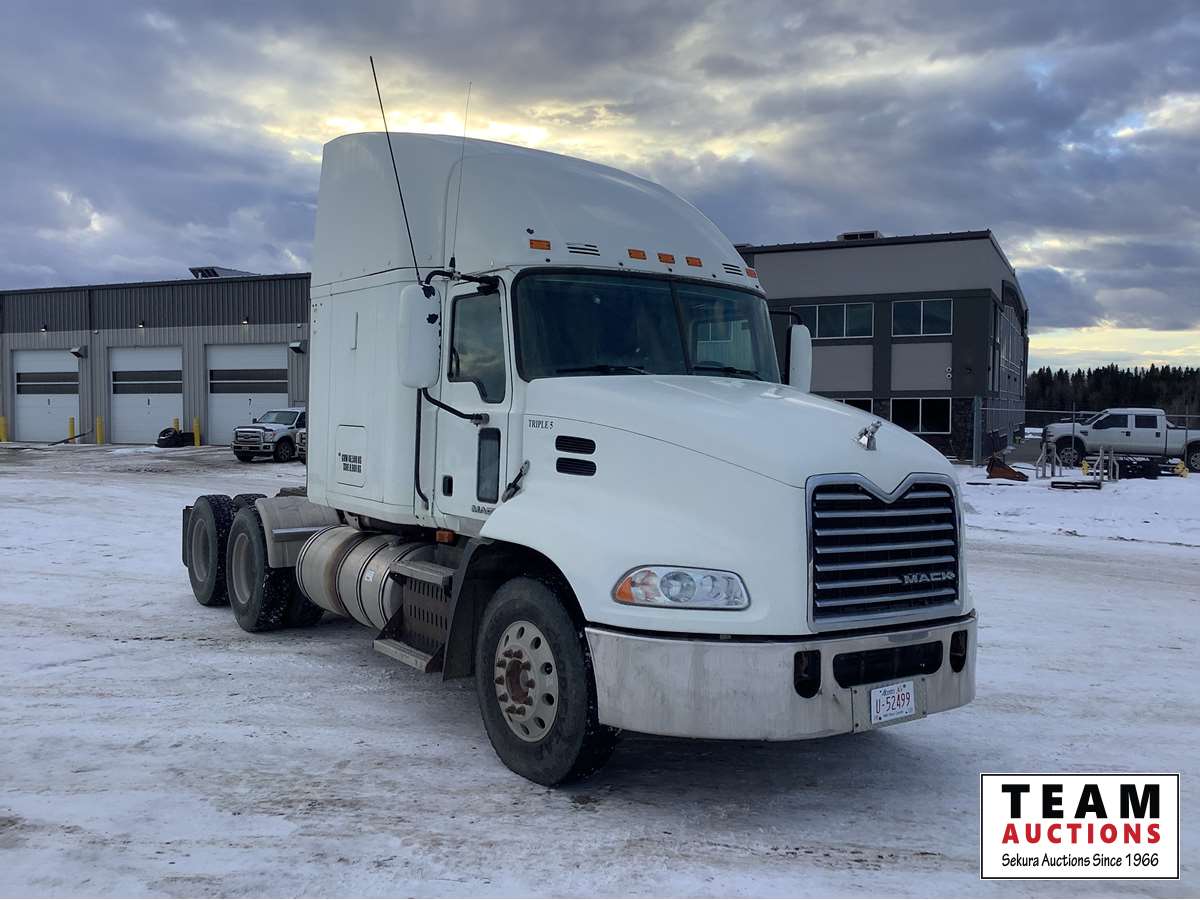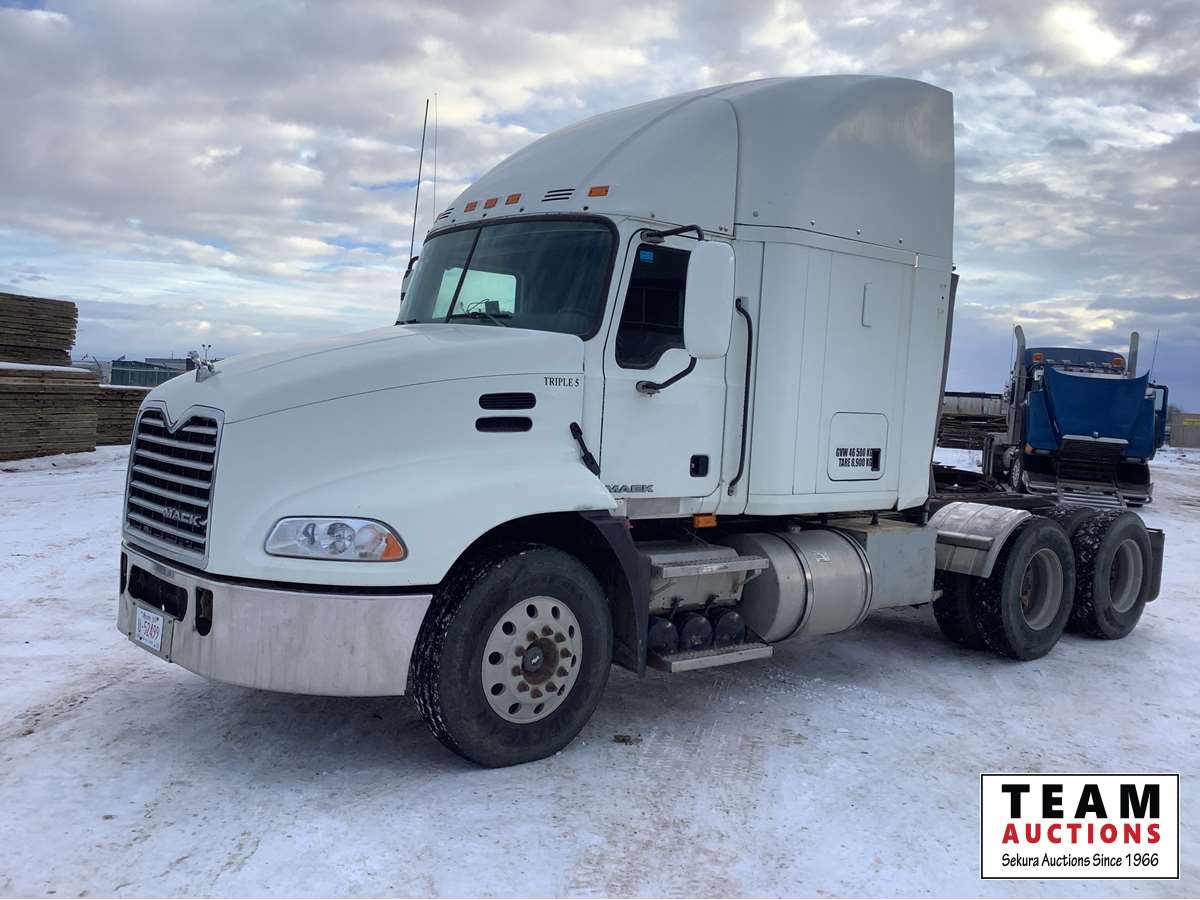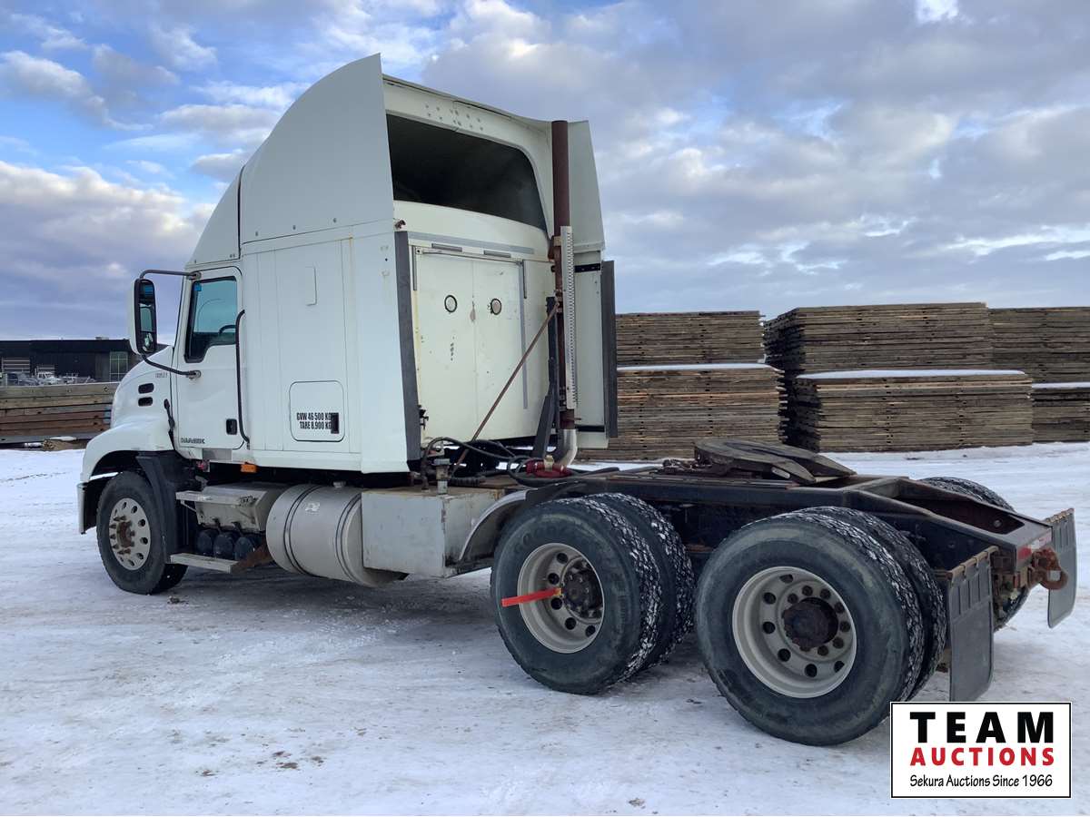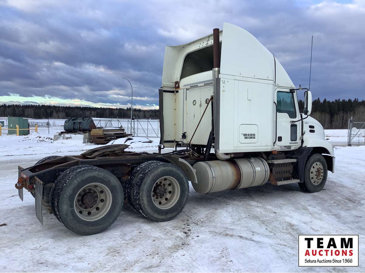Mack MP8-415C engine with engine brake, Fuller 13 speed transmission, air ride suspension, flat top sleeper, 2 way hydraulic system, air sliding 5th wheel, 12,000 lb front axle, 40,000 rears with lockers, 11R22.5 tires on aluminum rims, no current CVIP