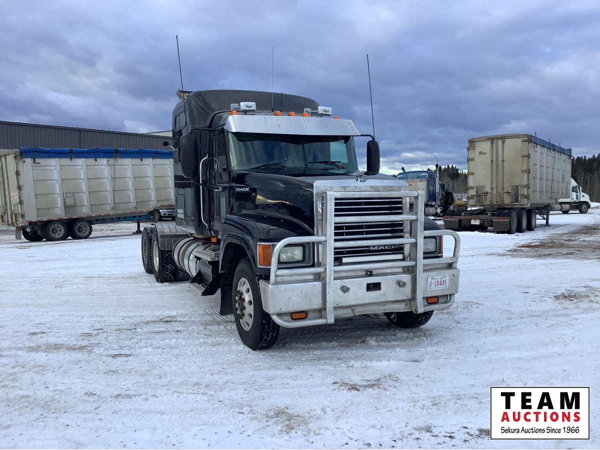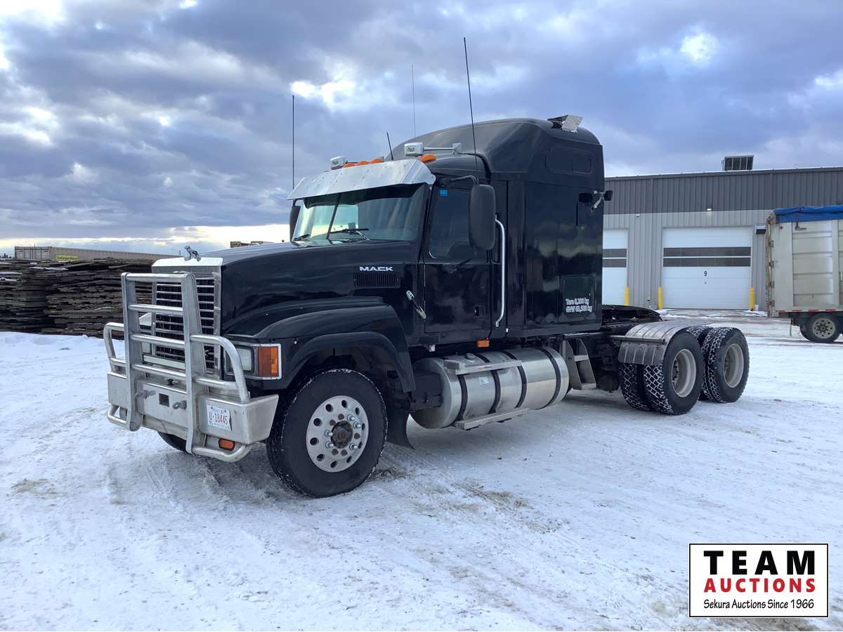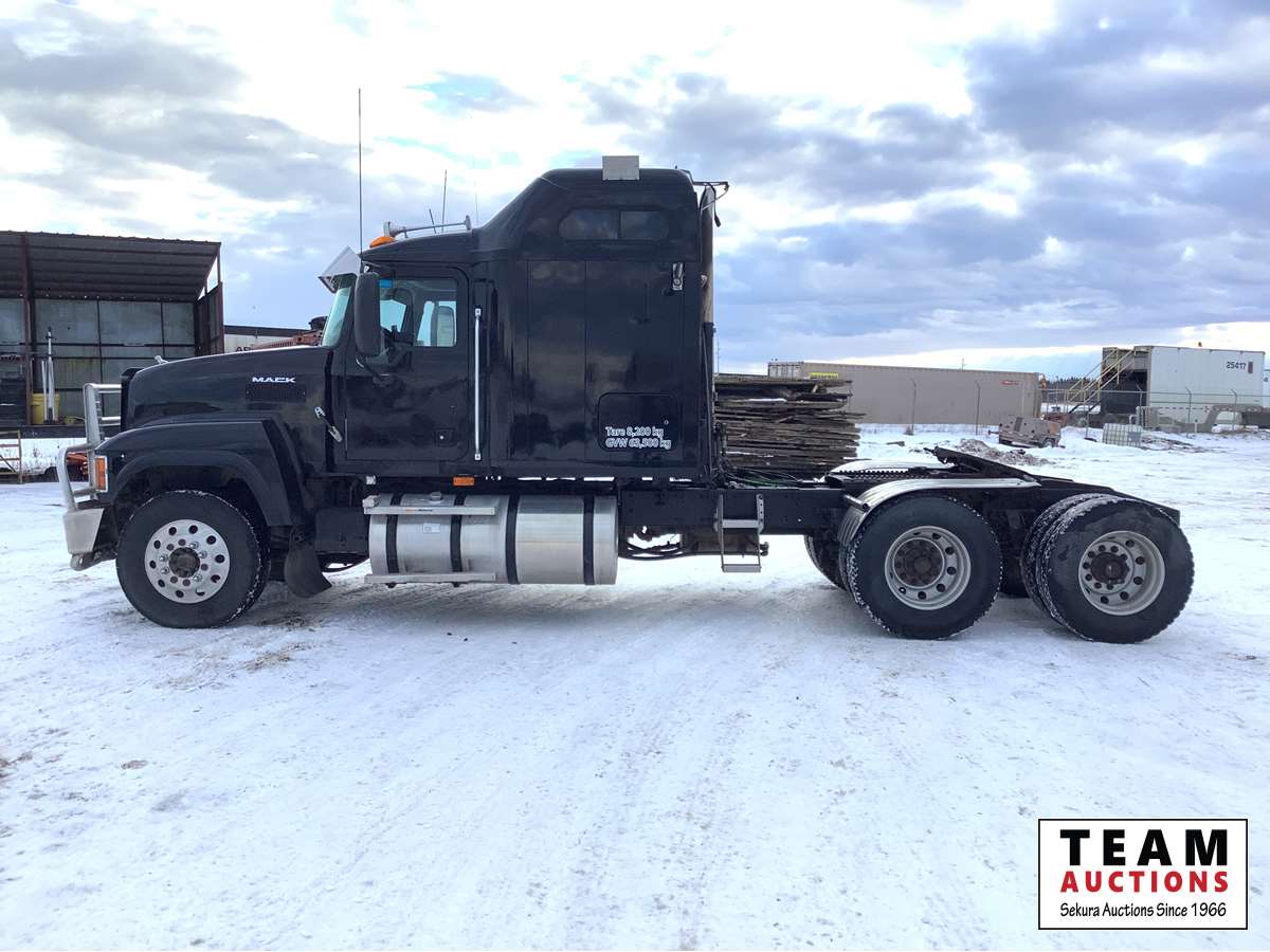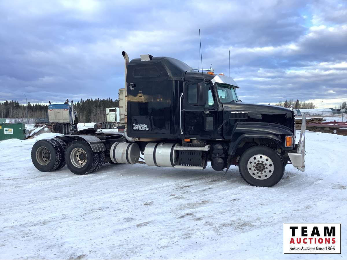 Mack MP8-485C engine with engine brake, Fuller 18 speed transmission, Webasto engine heater, mid rise sleeper, air ride suspension, air sliding 5th wheel, front rue bar, 12,000 lb front axle, 46,000 rears with lockers, 2 way hydraulic system, 11R22.5 tires on aluminum rims
