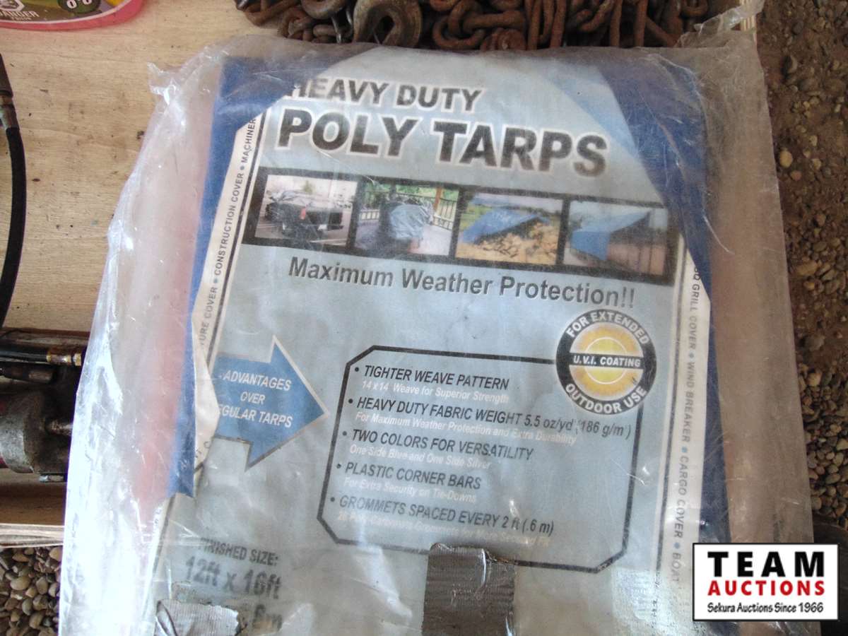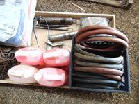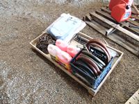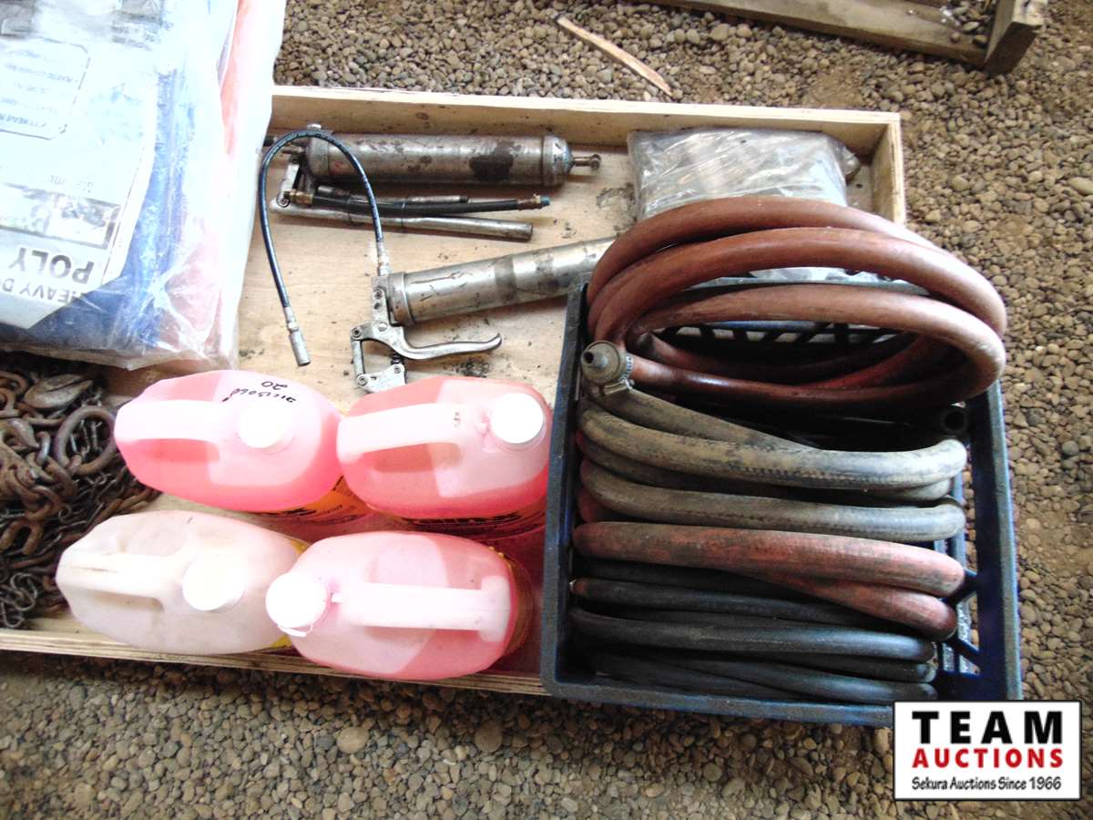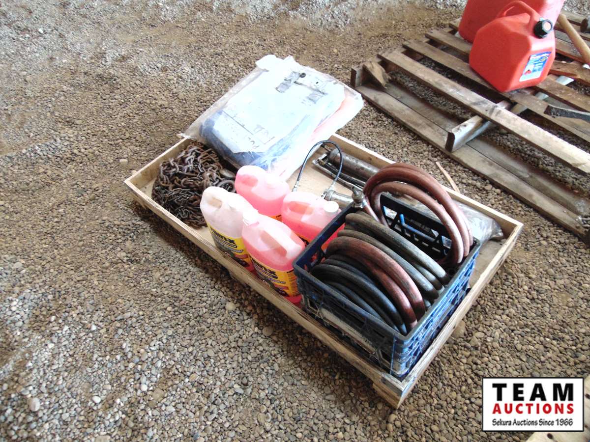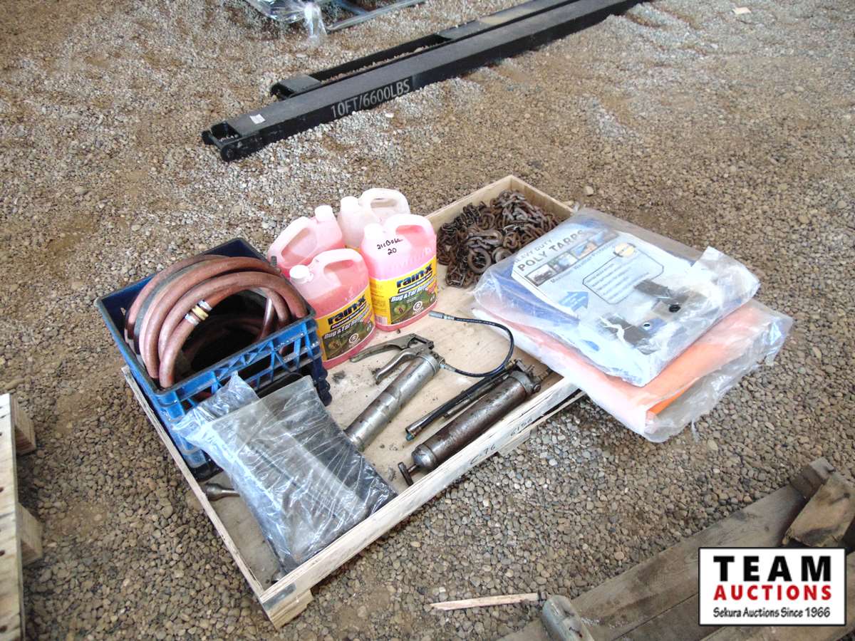 30 Pallet with (2) Unused Poly Tarps, Various Lengths Chain, Bug Wash, (2) Grease Guns, Garden Hoses