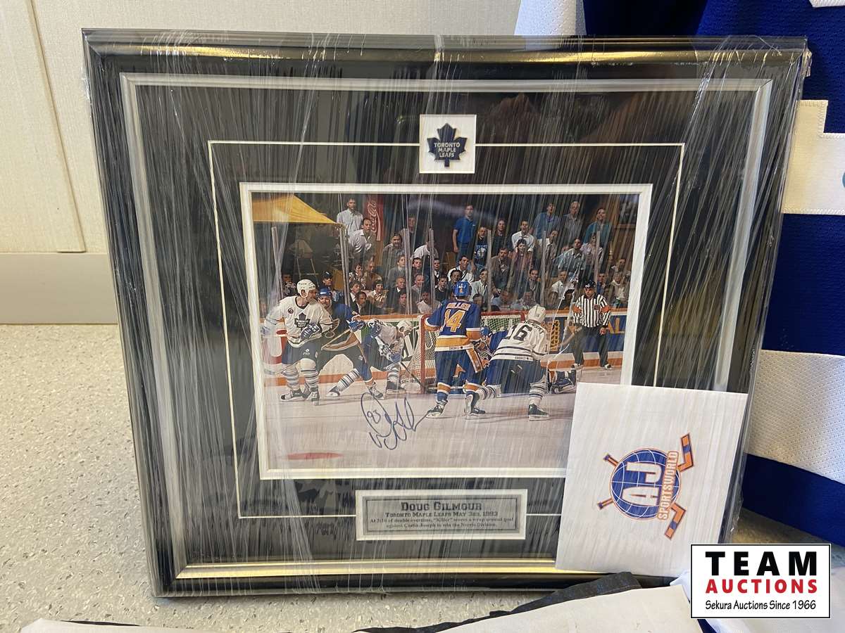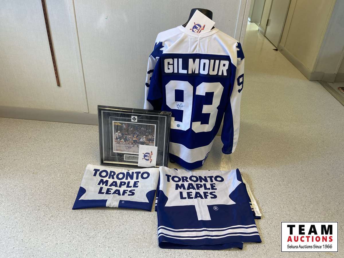 26 Doug Gilmour Signed Jersey, (2) Toronto Maple Leaf Flags & Doug Gilmour Signed Portrait