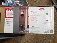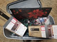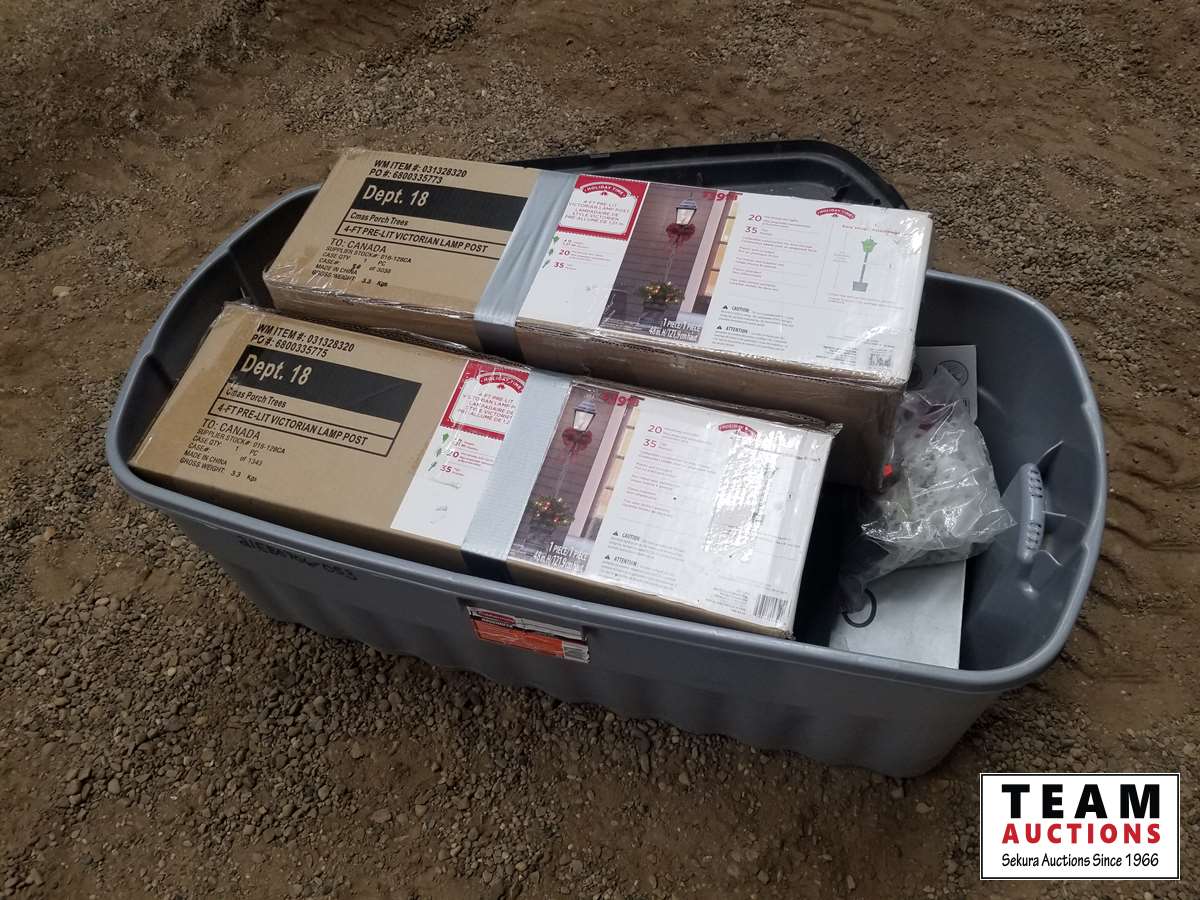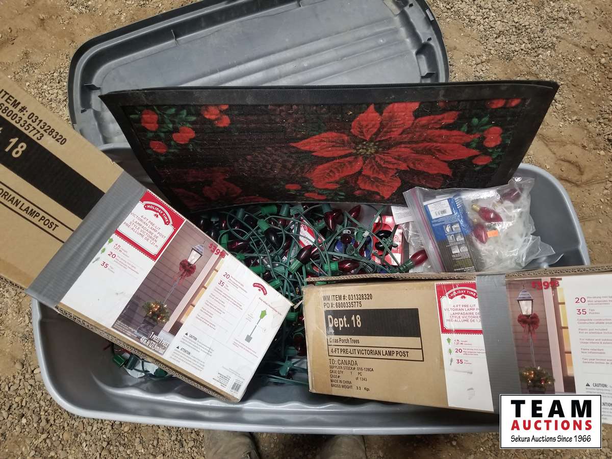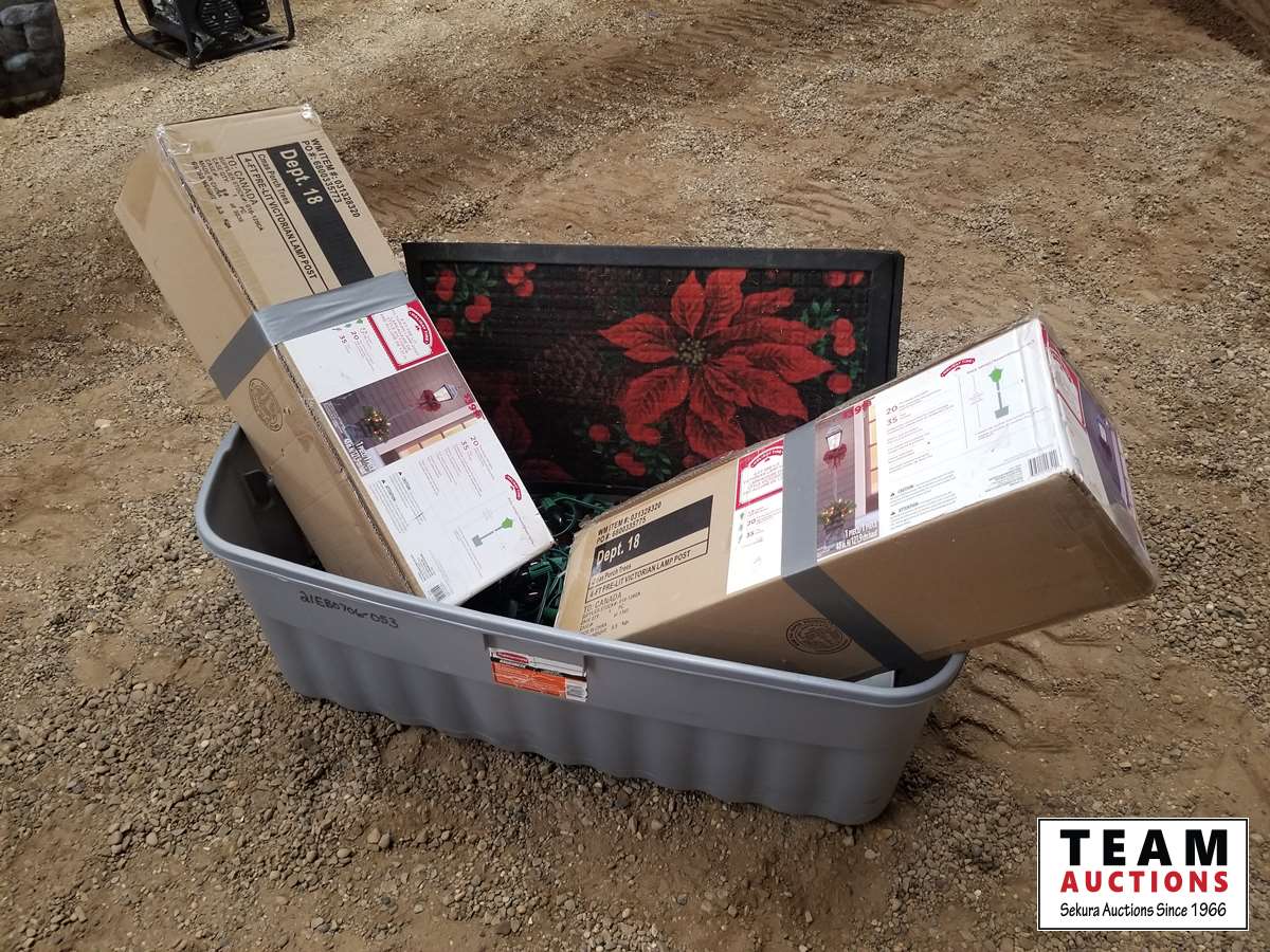 110 Extra Large Tote With (2) 4 Ft Prelit Victorian Lamp Posts, (2) Rubber Christmas Mats, Christmas Lights, & Misc
