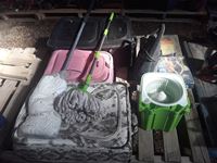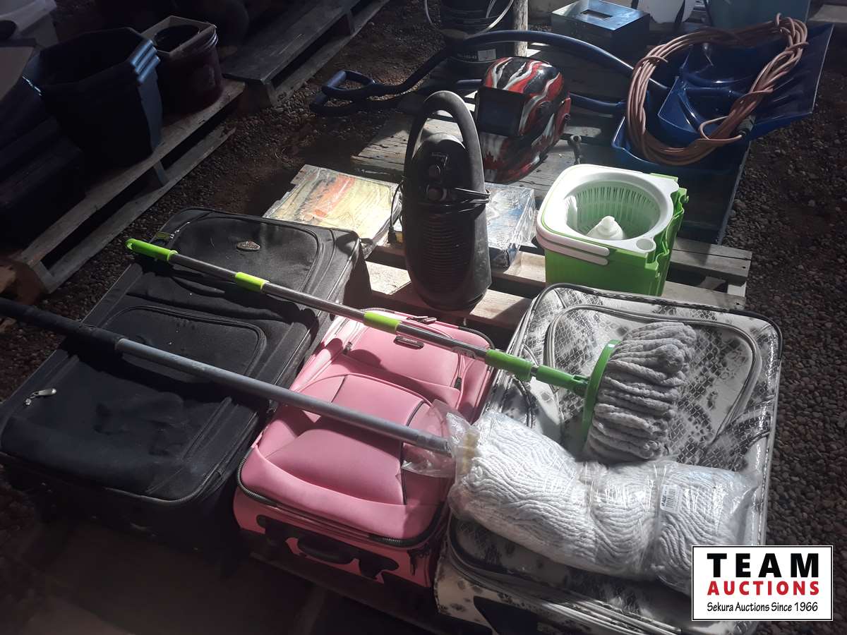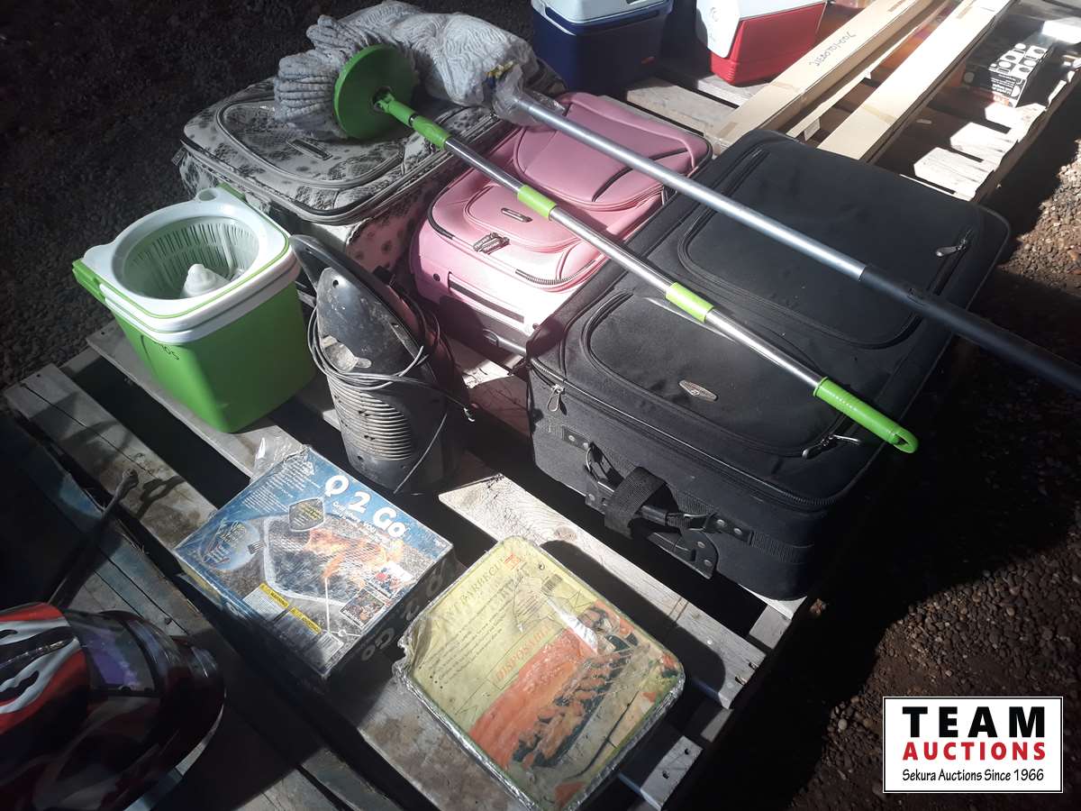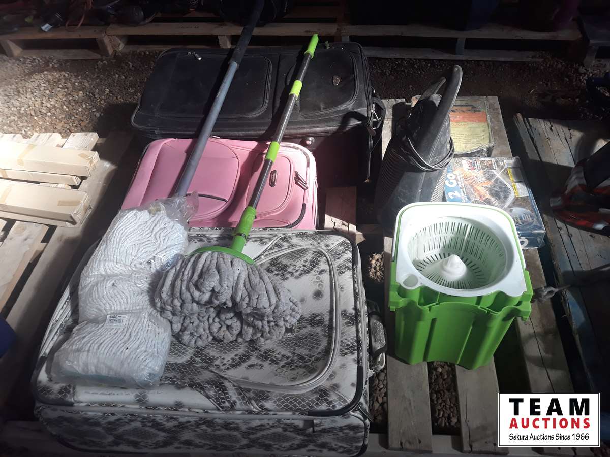 367 Pallet of (3) Suitcases, (2) Mops, Mop Pale & Small Heater