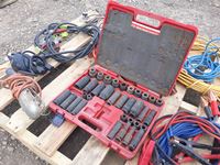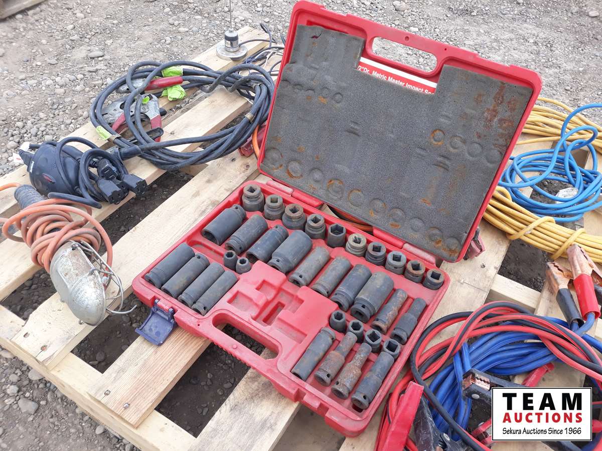 383 Pallet of Booster Cables, Extension Cords & 1/2 Inch Drive Metric Impact Socket Set