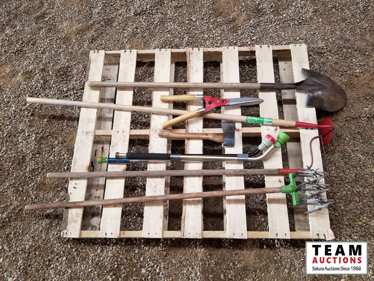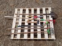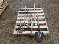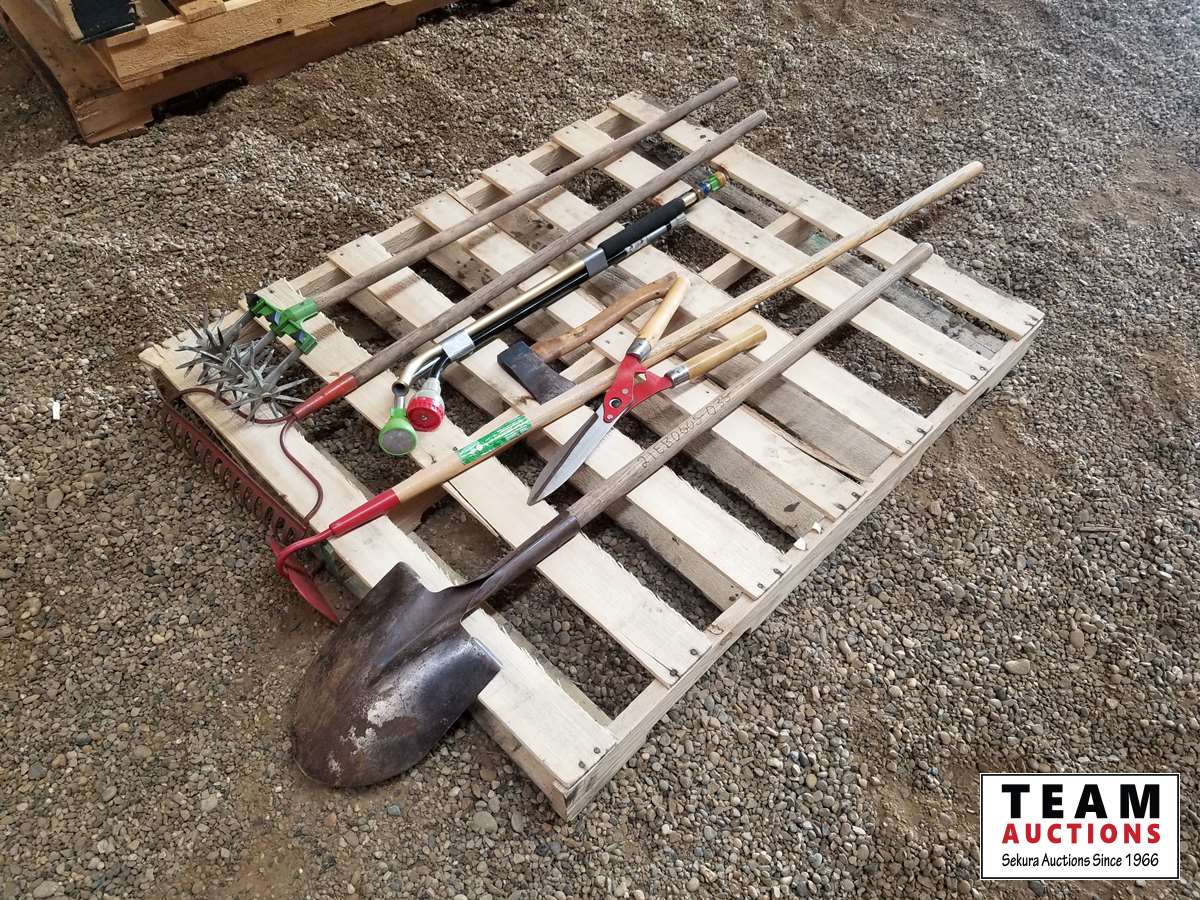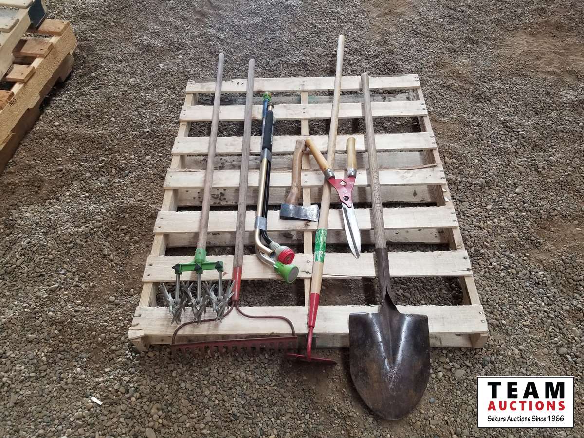399 Pallet of Misc Garden Tools, Shovels, Rake, Scissors, Axe, Hoe & Misc