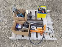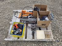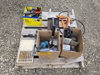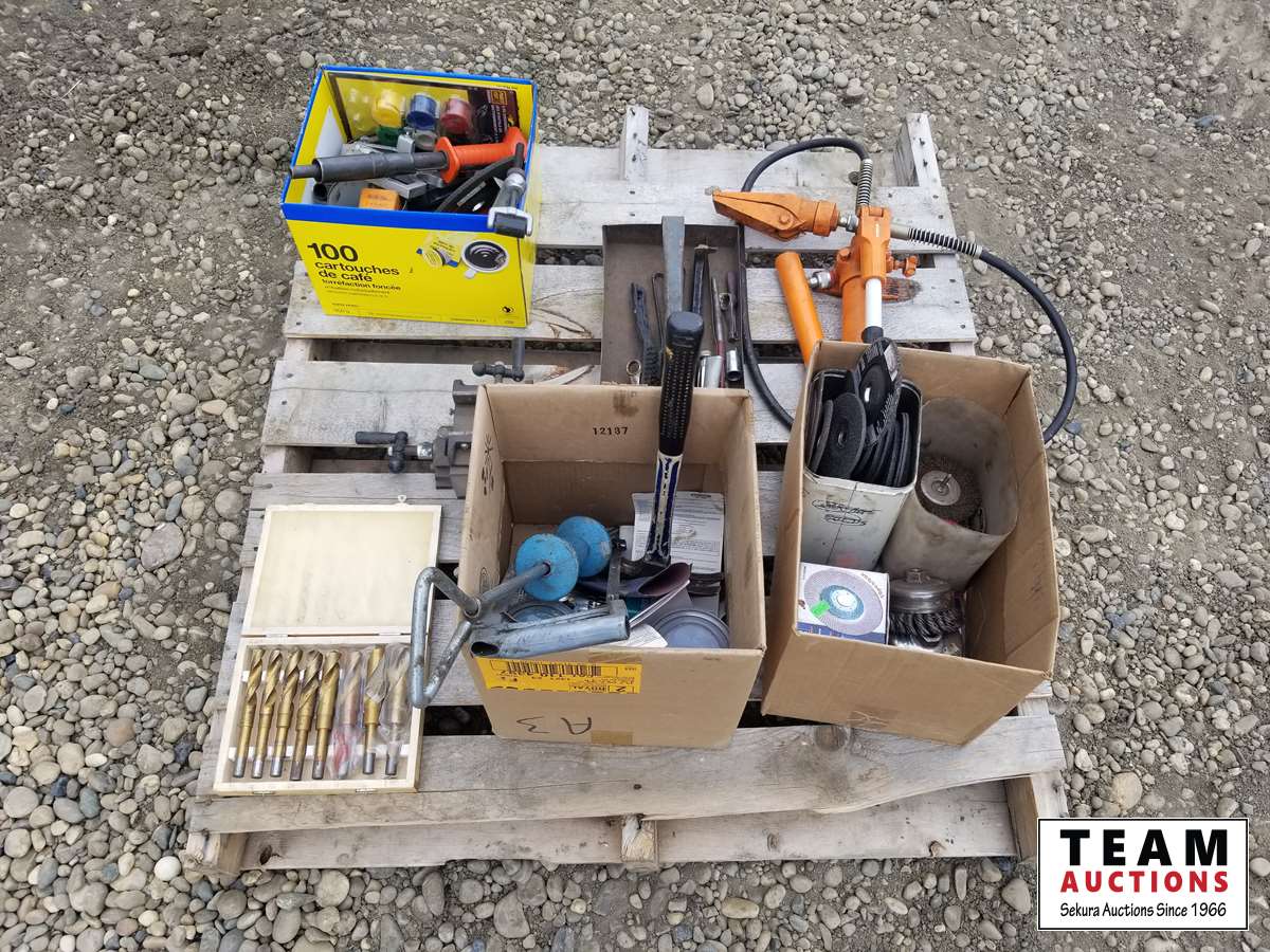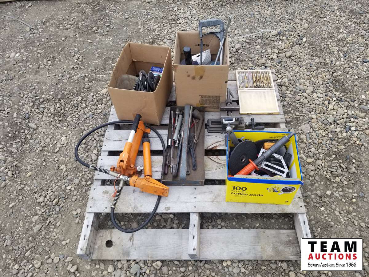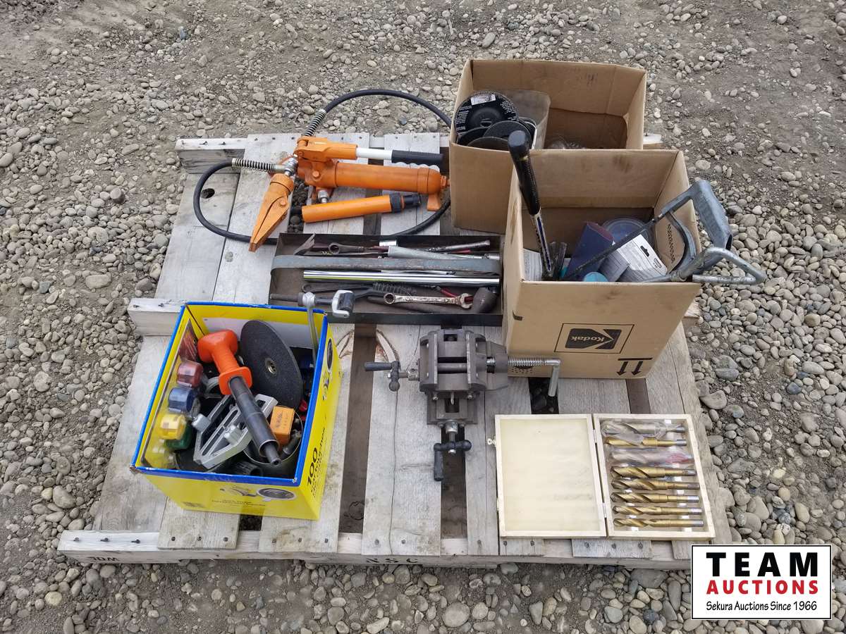 334 Pallet of Misc Shop Tools, Drill Bit, Small Shop Bench Vise, Grinder Blades & Misc Tools