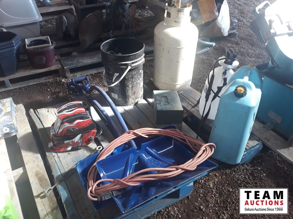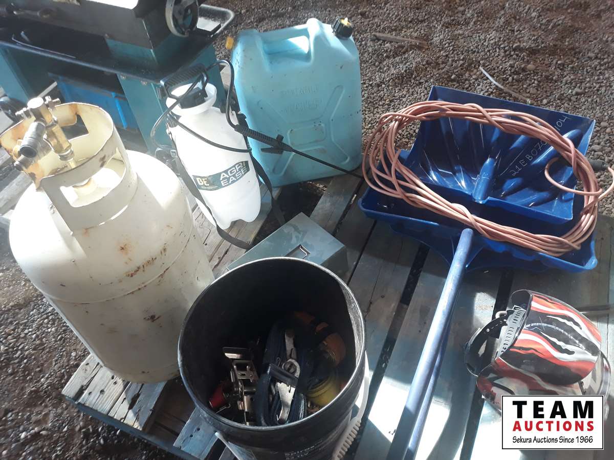 366 Pallet Of Shop Supplies, Extension Cords, Snow Shovels, Ratchet Straps, Small Chemical Sprayer & Potable Water Container