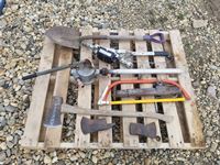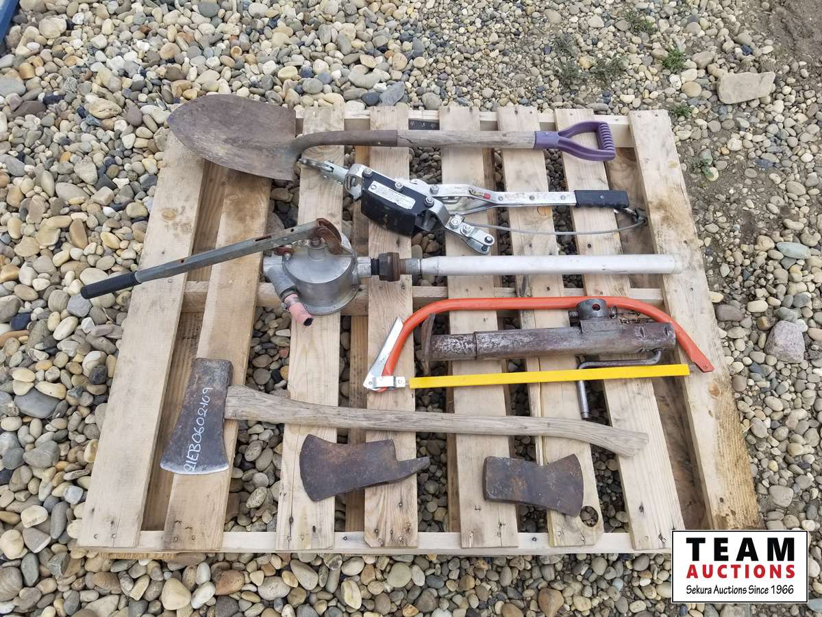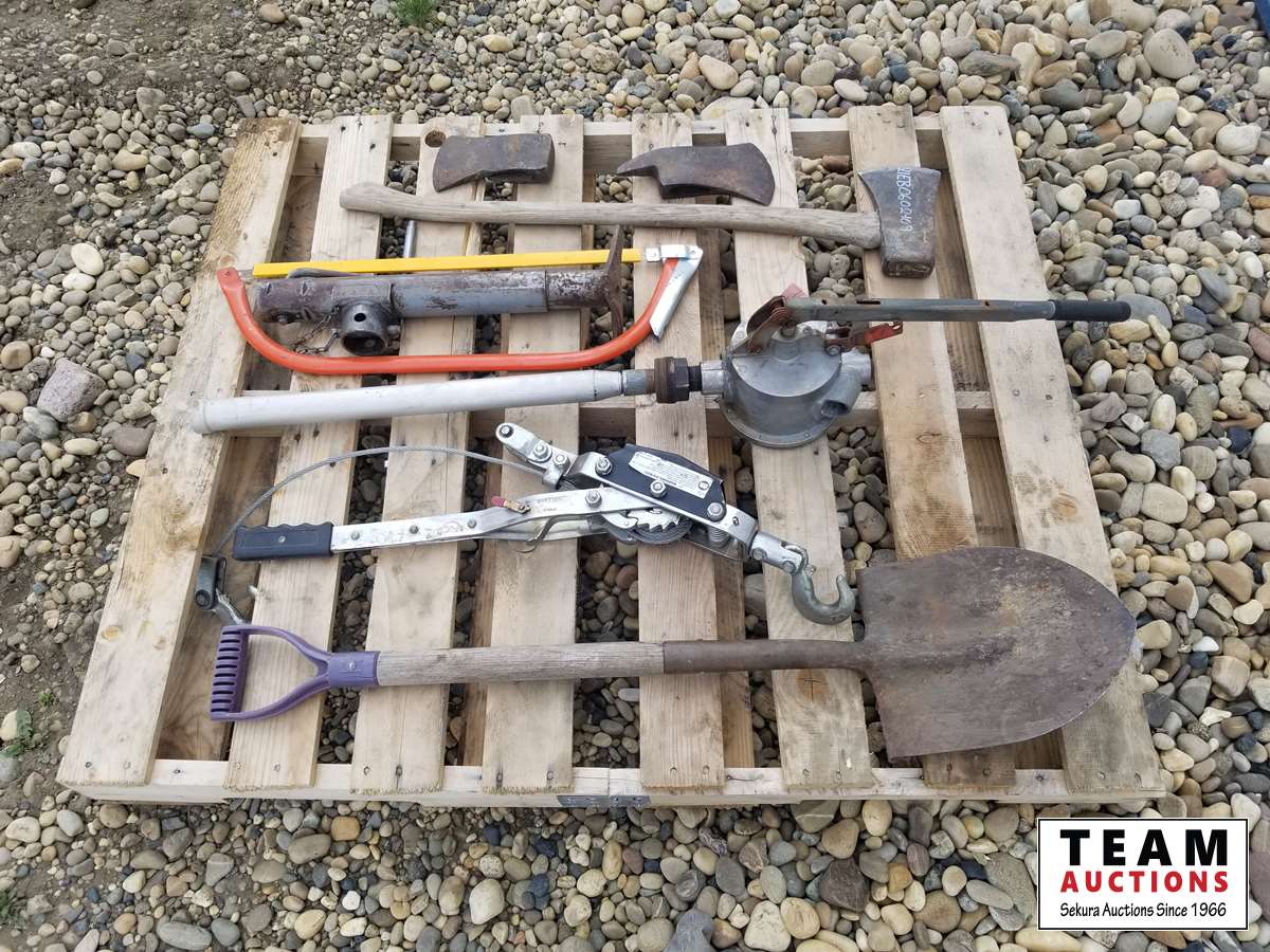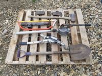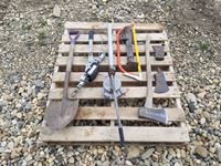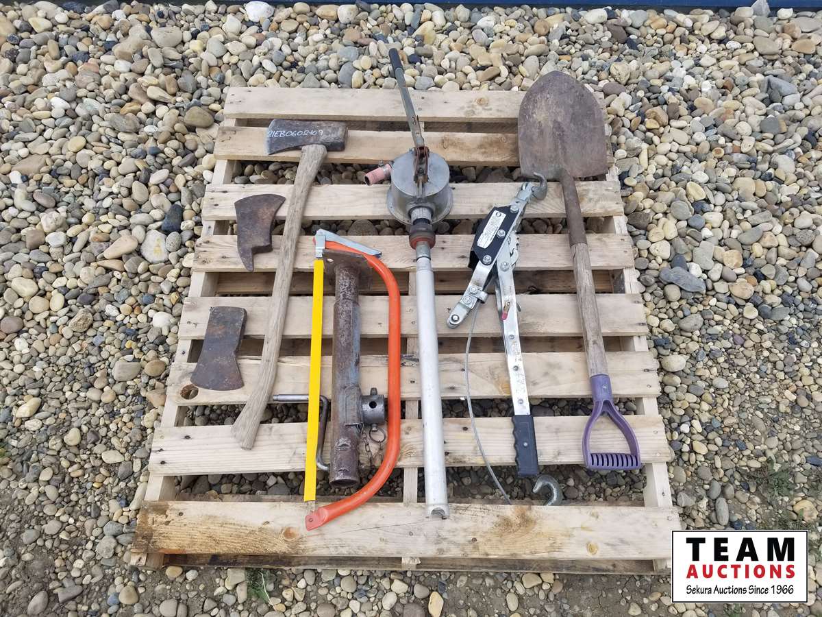 471 Pallet of Shovels, Jockey Tank, Hand Pump, Axes, Trailer Jacks & Misc