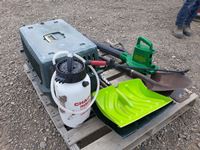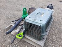 480 Pallet of Shovels, Pet Crate, Leaf Blower & Chemical Sprayer