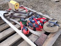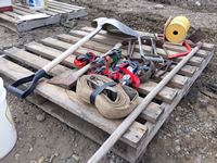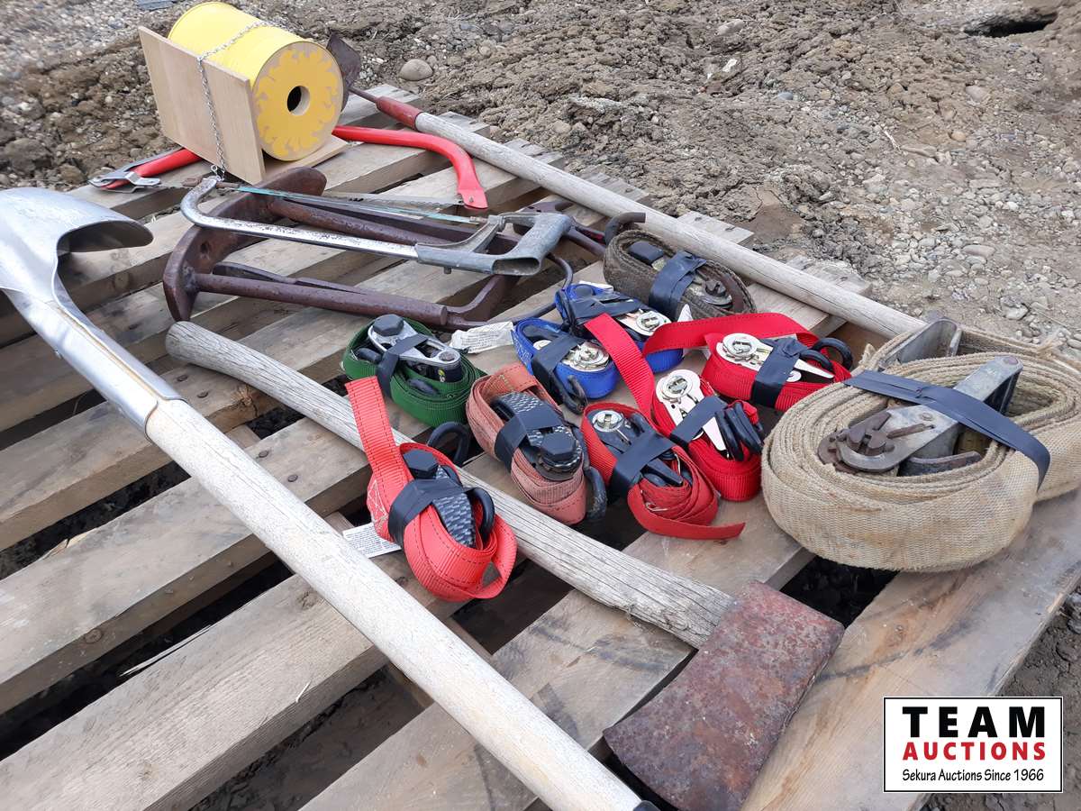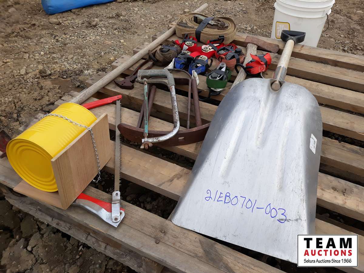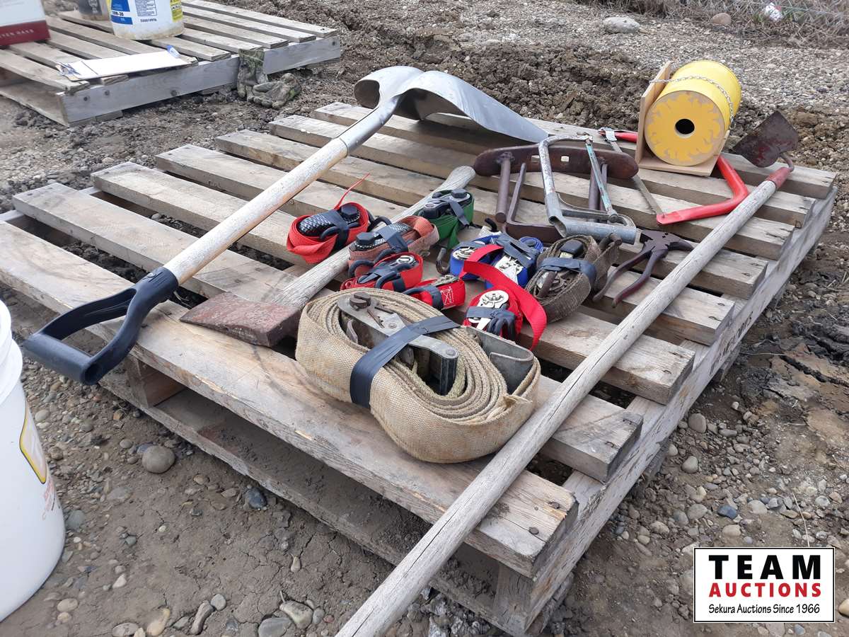 351 Pallet Of Straps, Saws, Shovels, Axe & Bird House