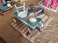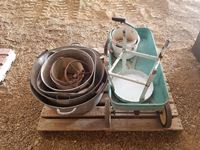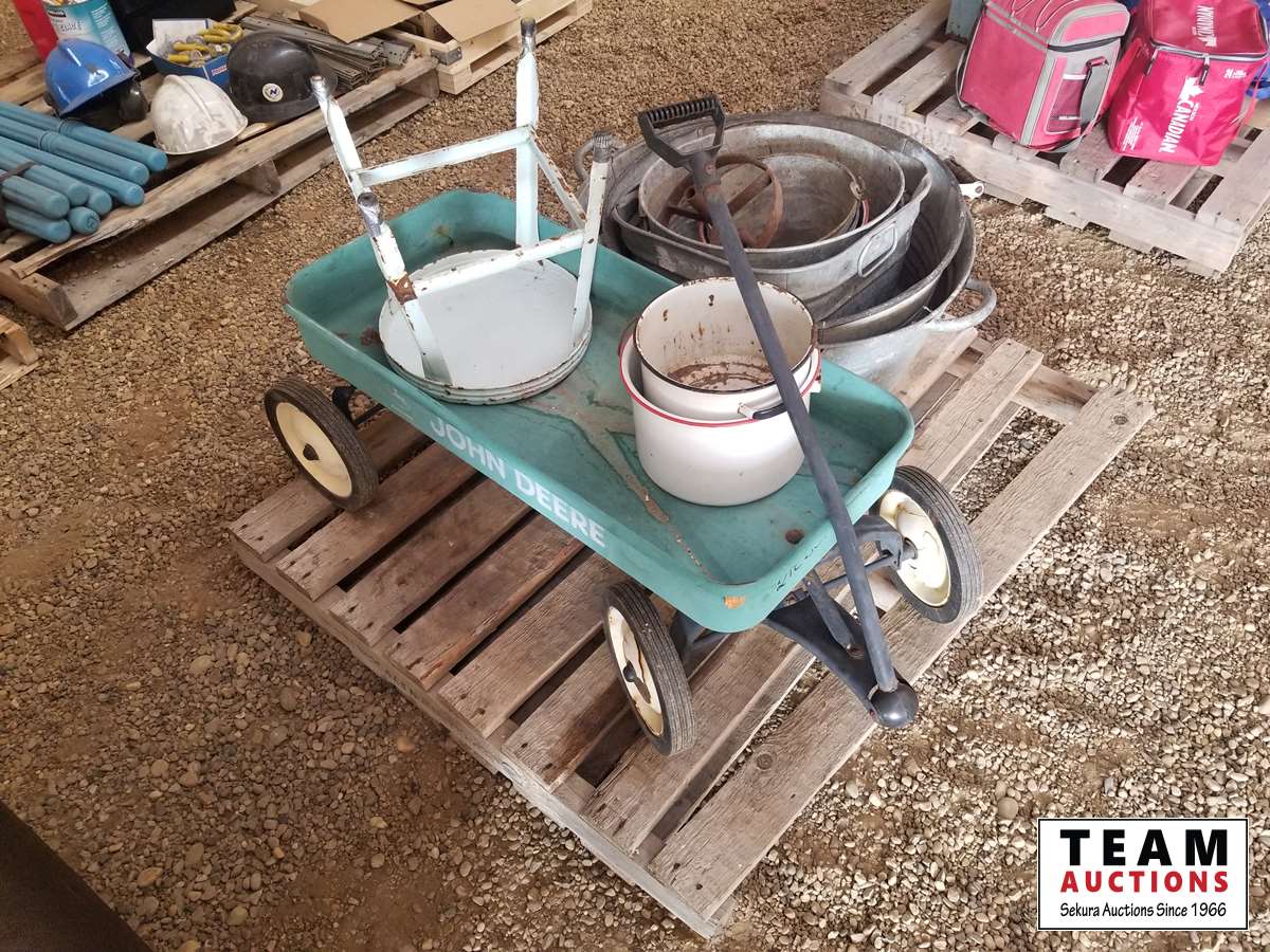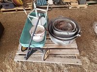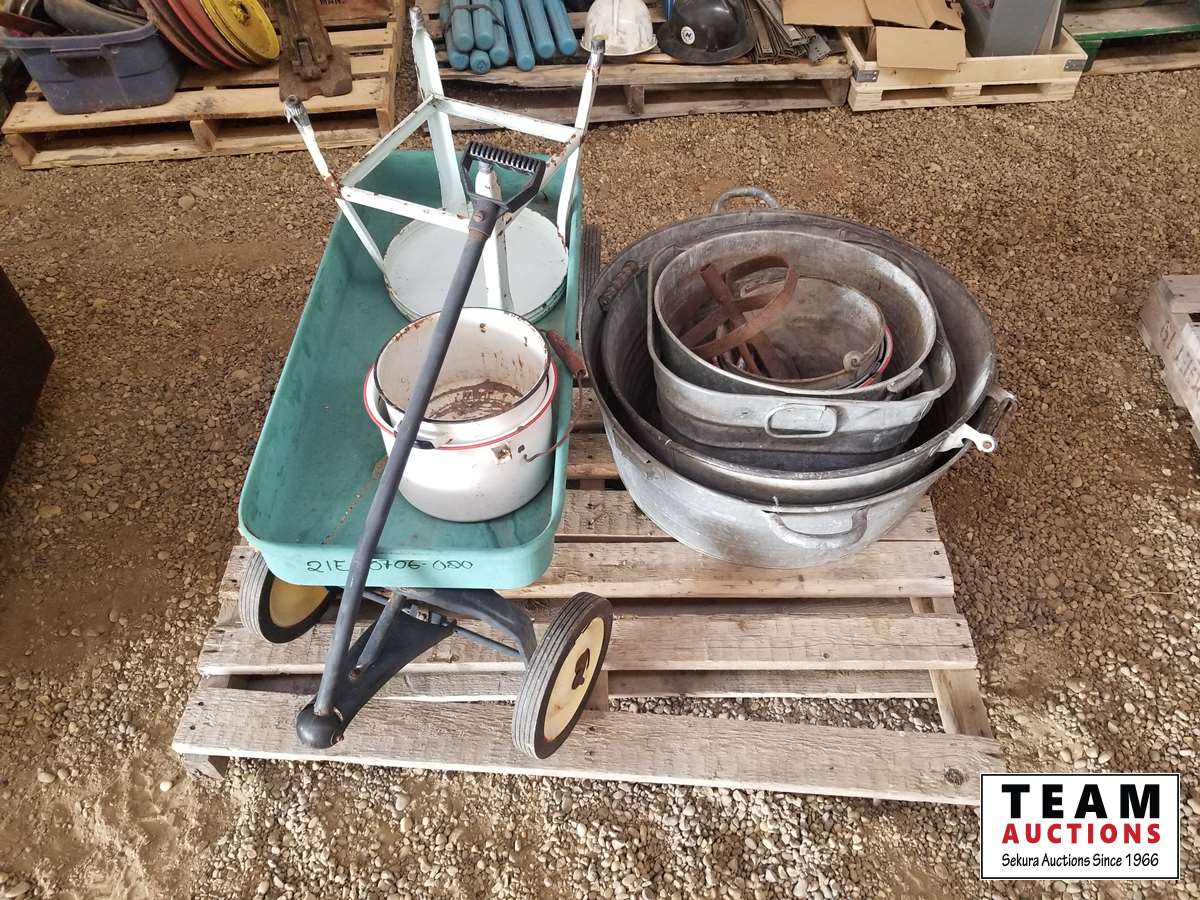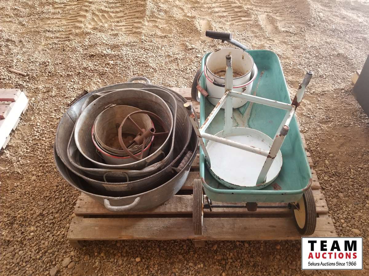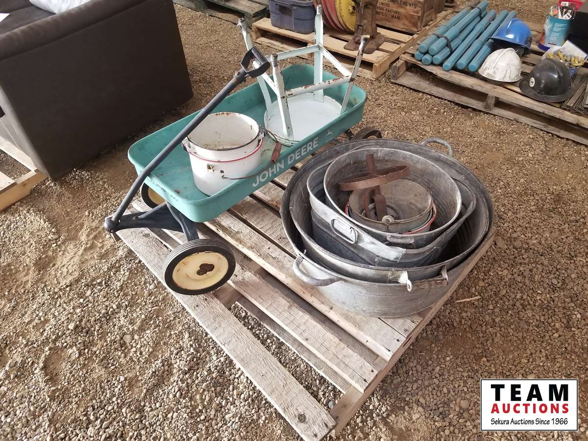 286 Pallet with Old John Deere Wagon & Misc Sizes of Tin Tubs