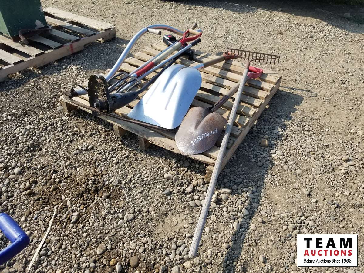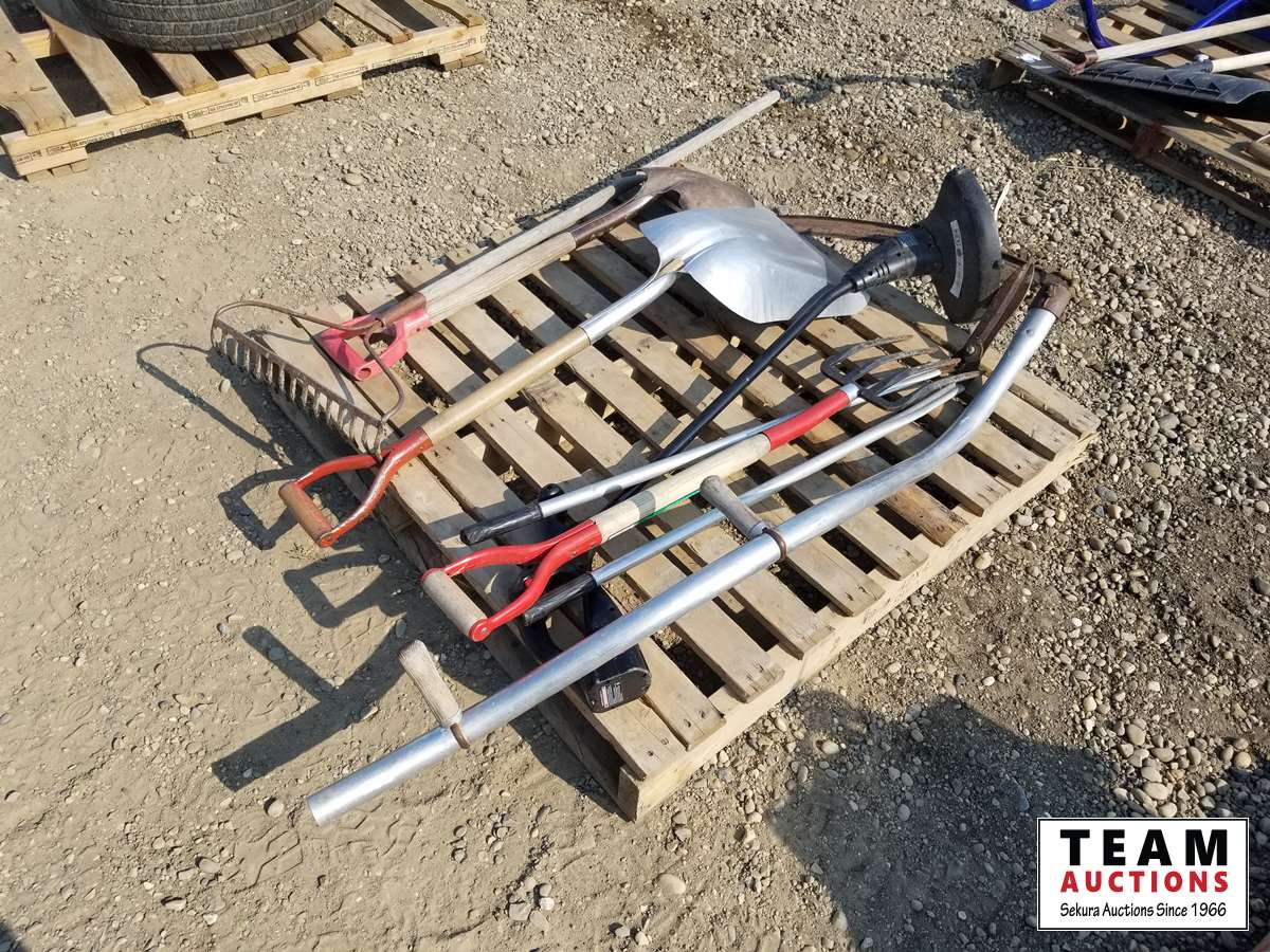 Miscellaneous shovels, fork, rack, weed trimmer & miscellaneous