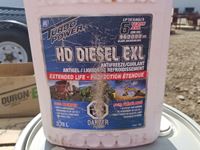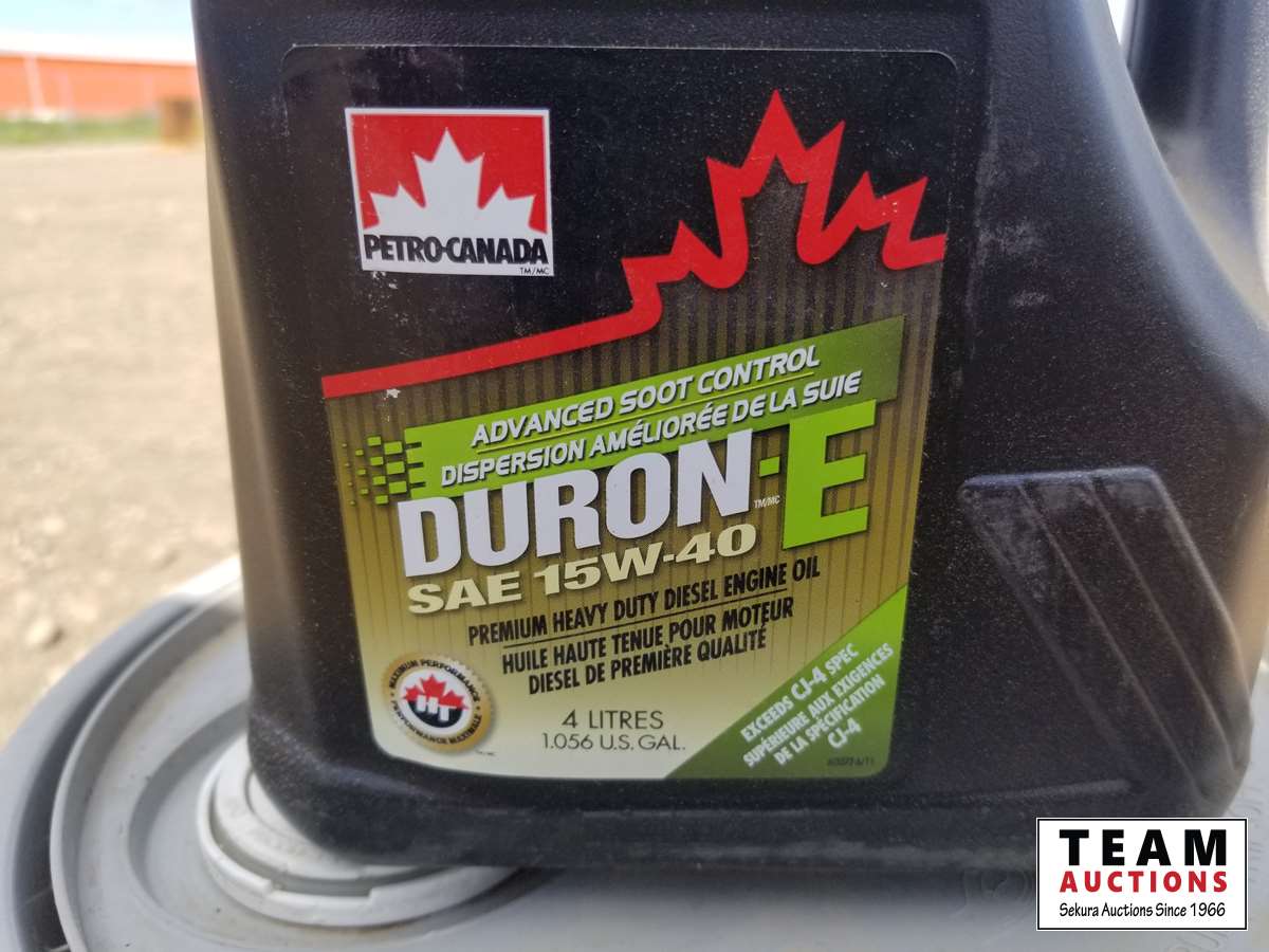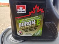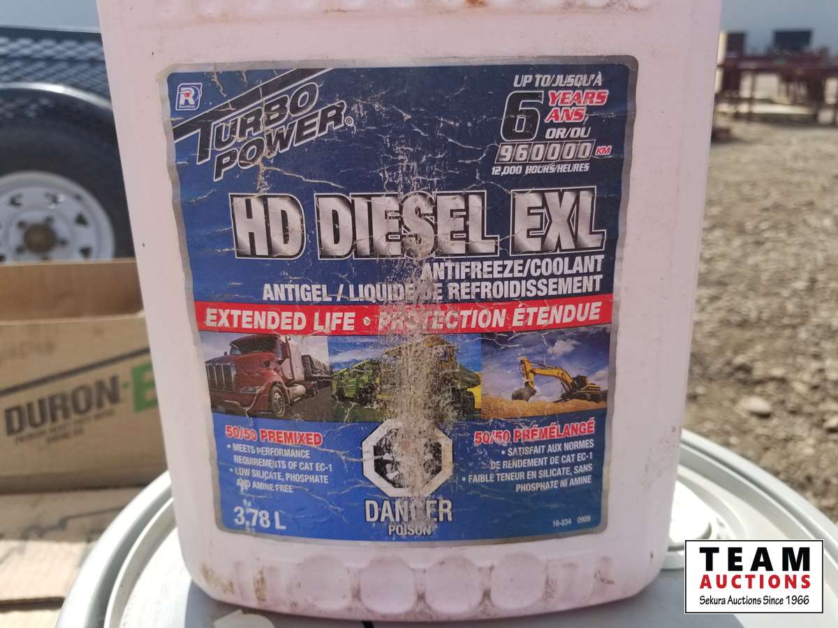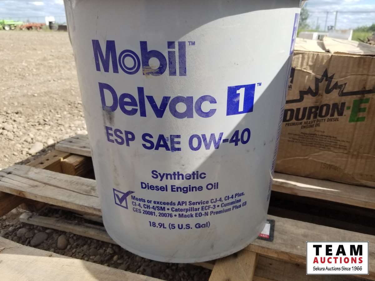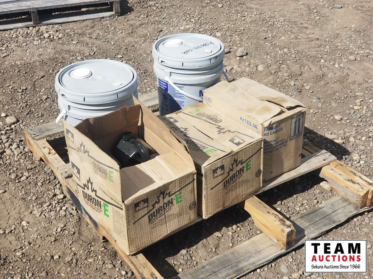 (2) 5 gallon pails OW-40 synthetic oil, (8) 4 liter 15W-40 oil, and box of unopened antifreeze