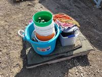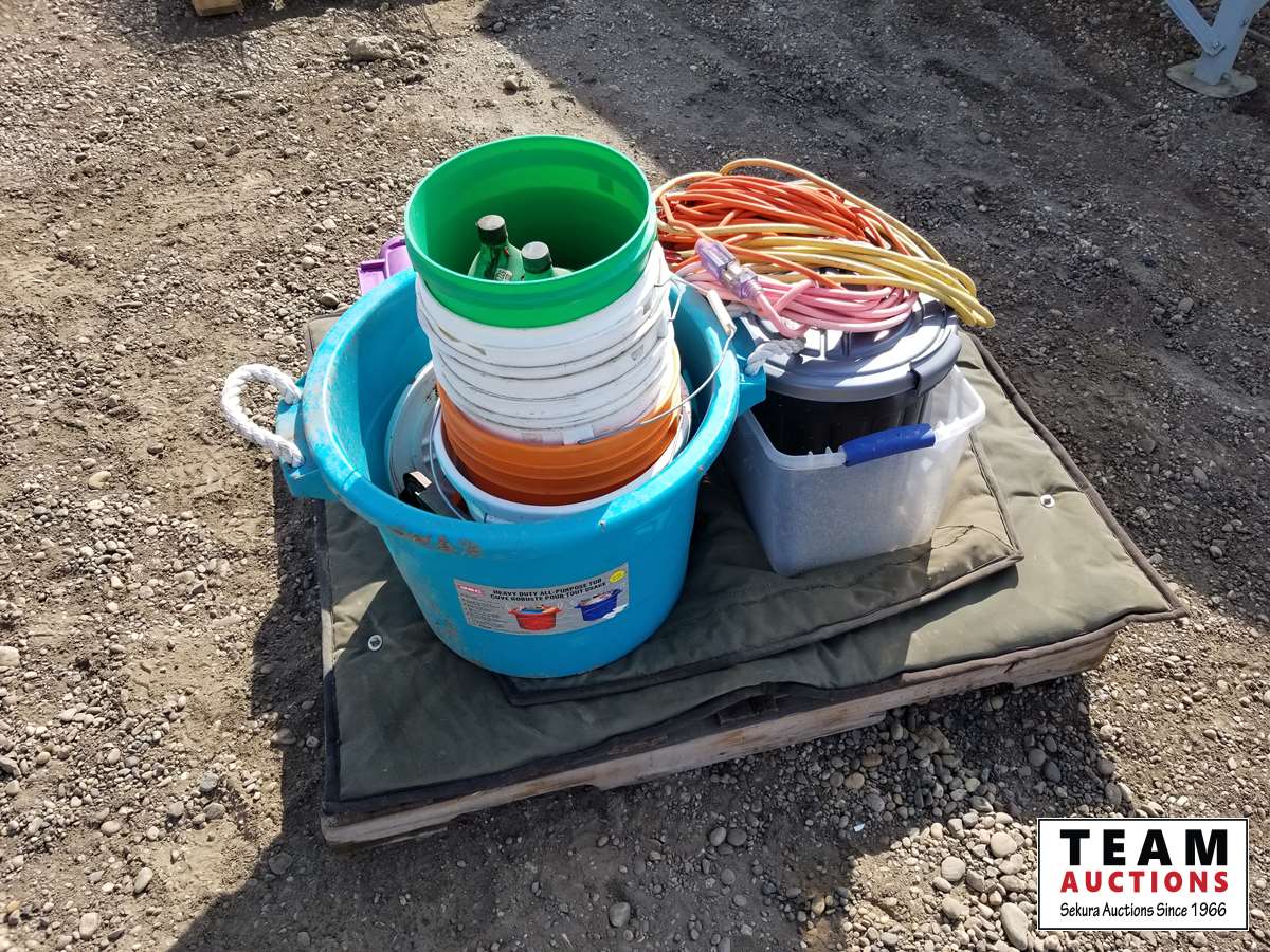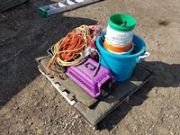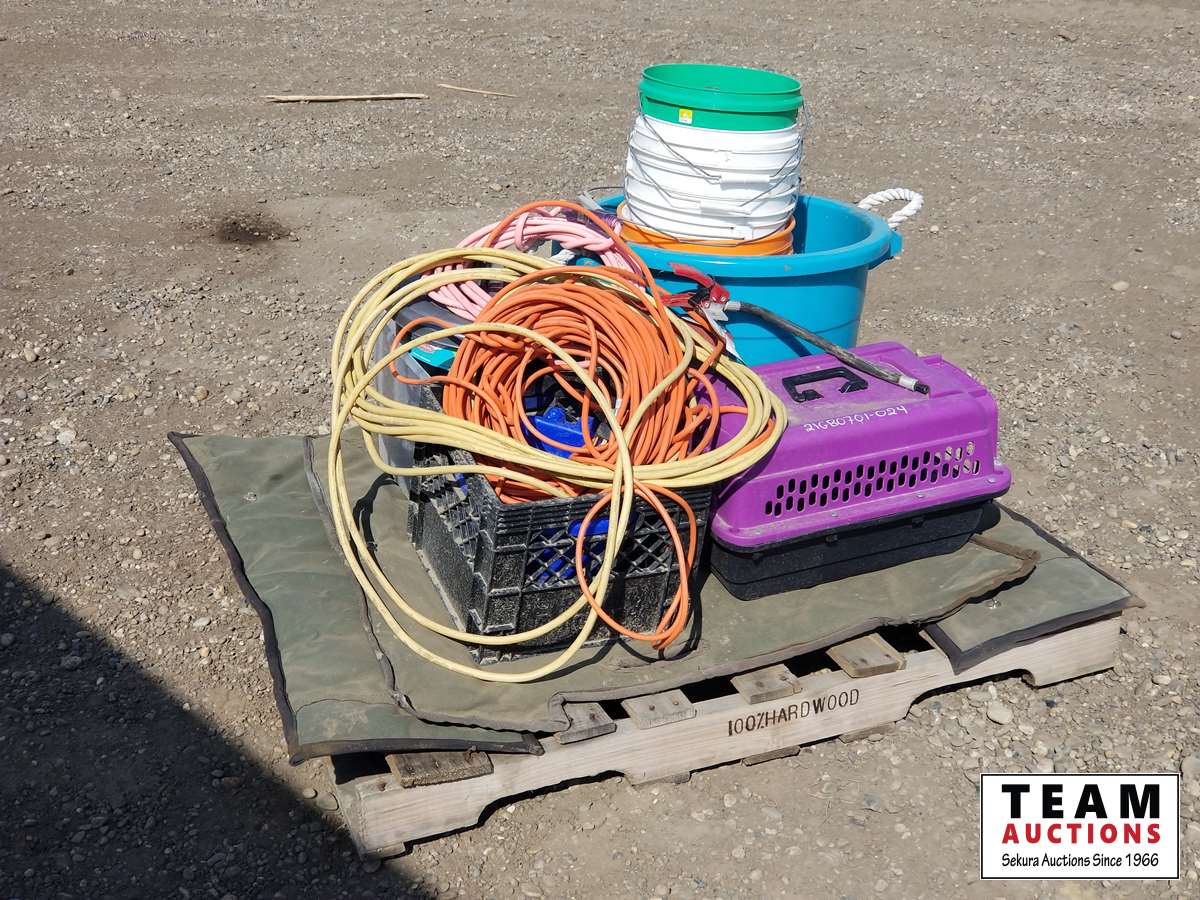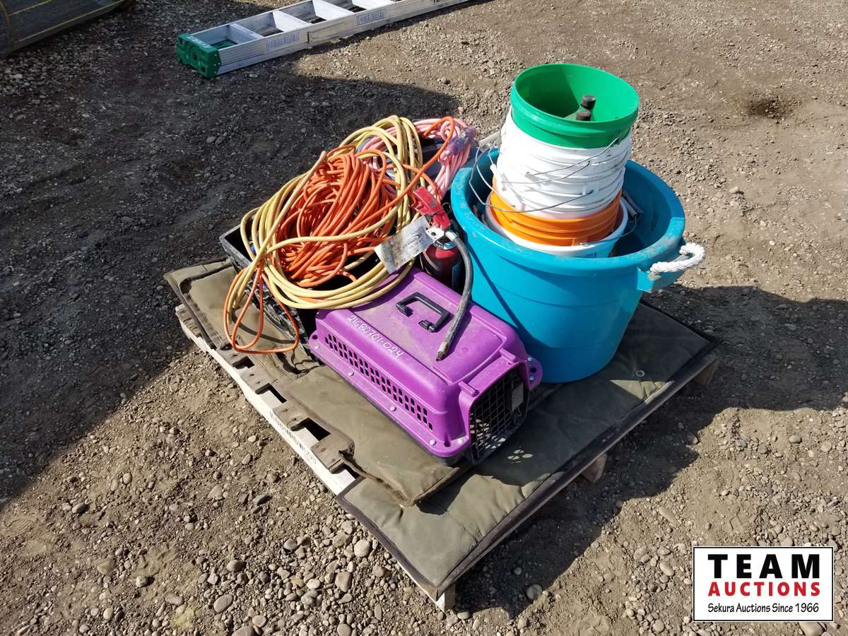 Containers, pails, cat crate, extension cords & miscellaneous