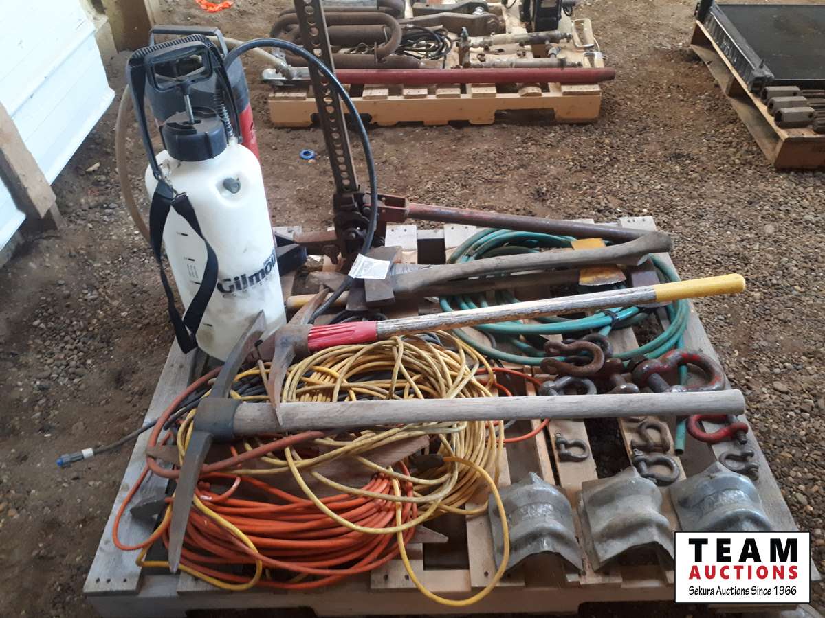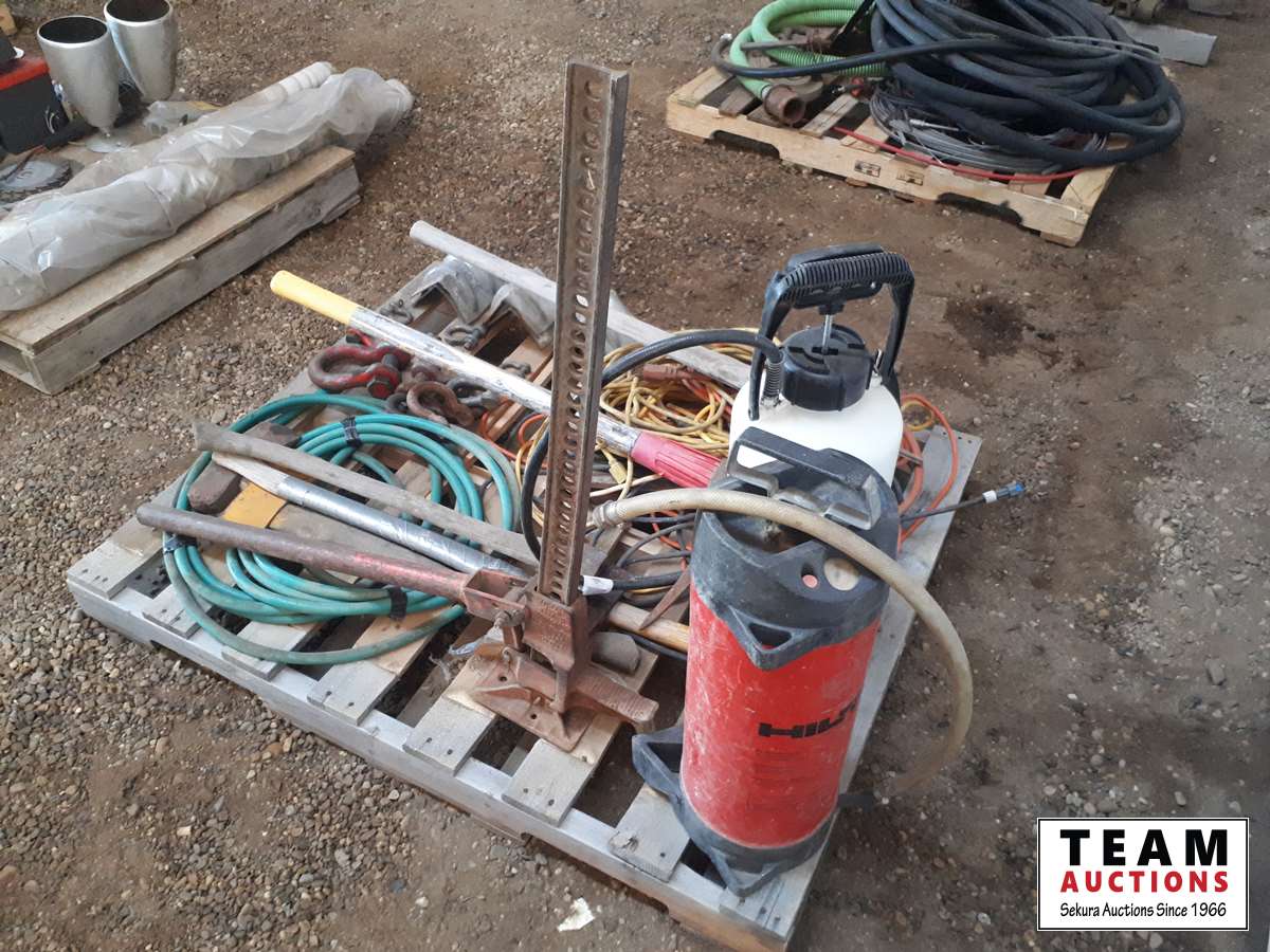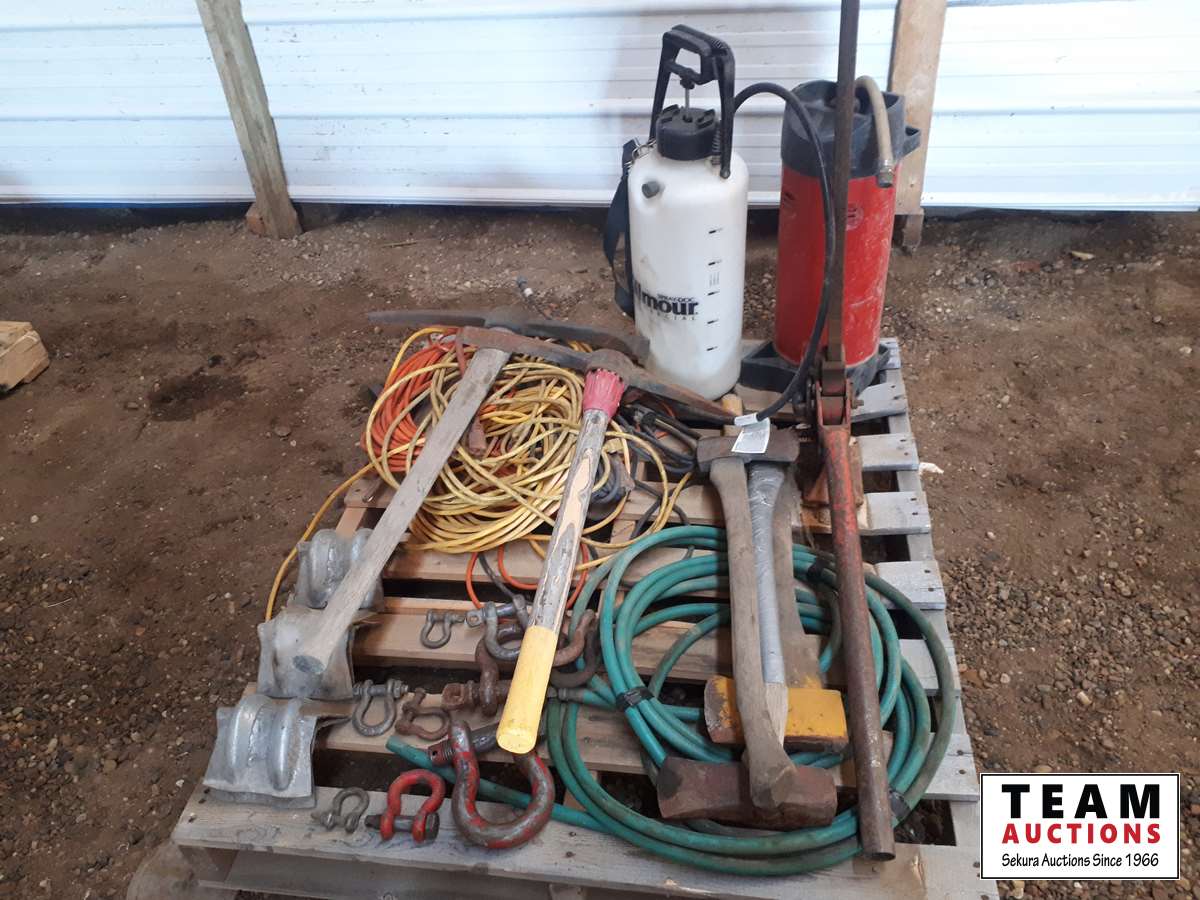 Bumper jacks, extension cords, clevises, water hose, axes, hand pump sprayers, Hilti pressure sprayer does not work, & miscellaneous