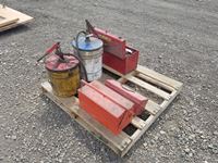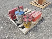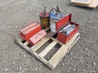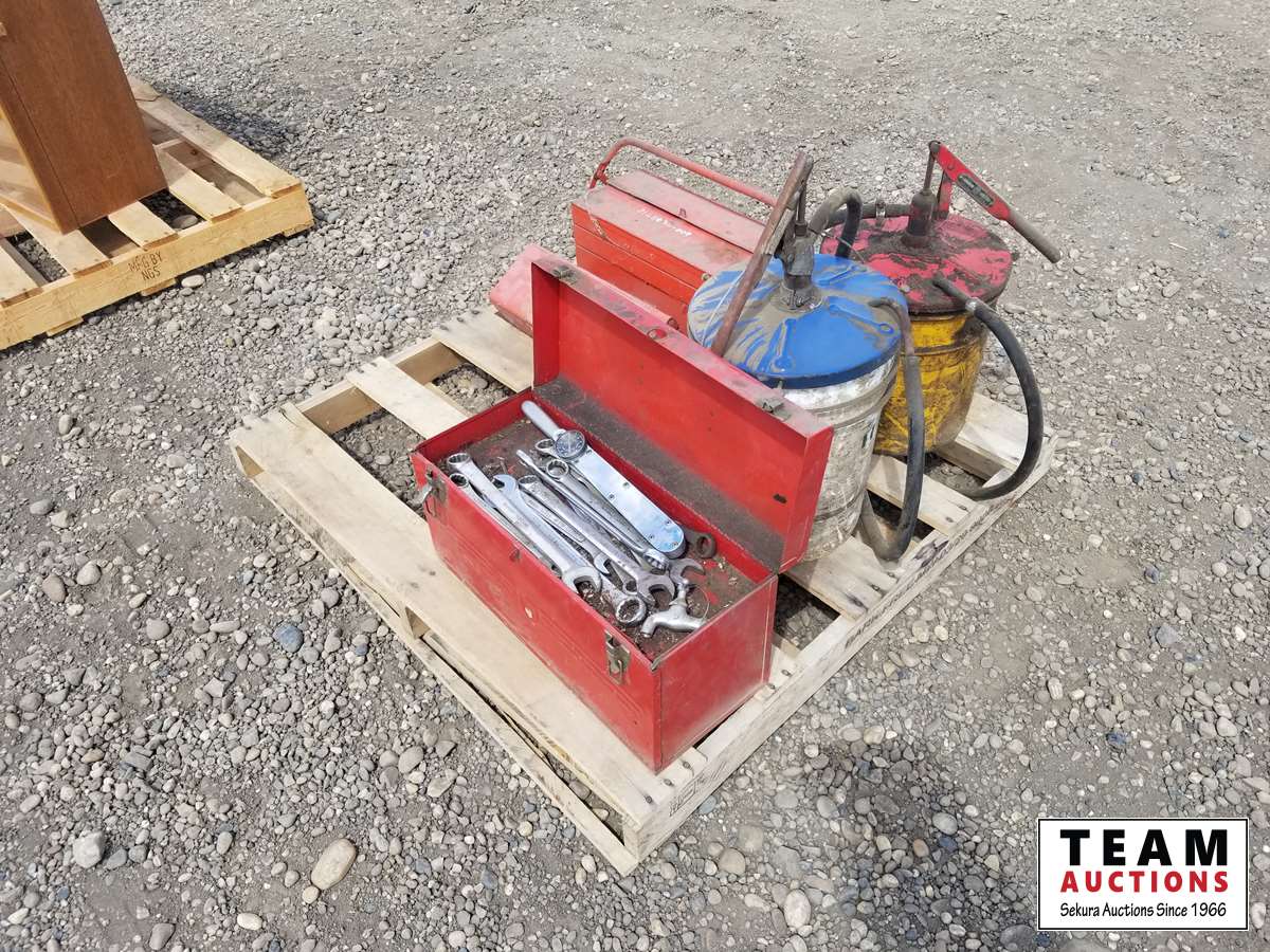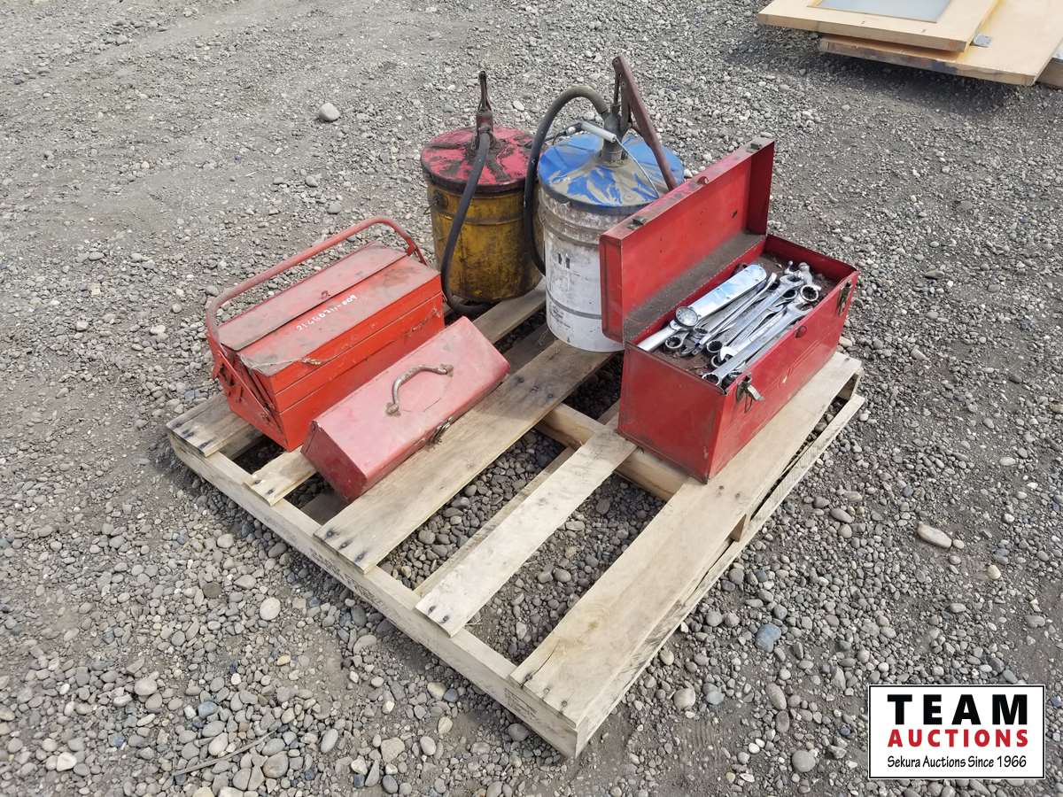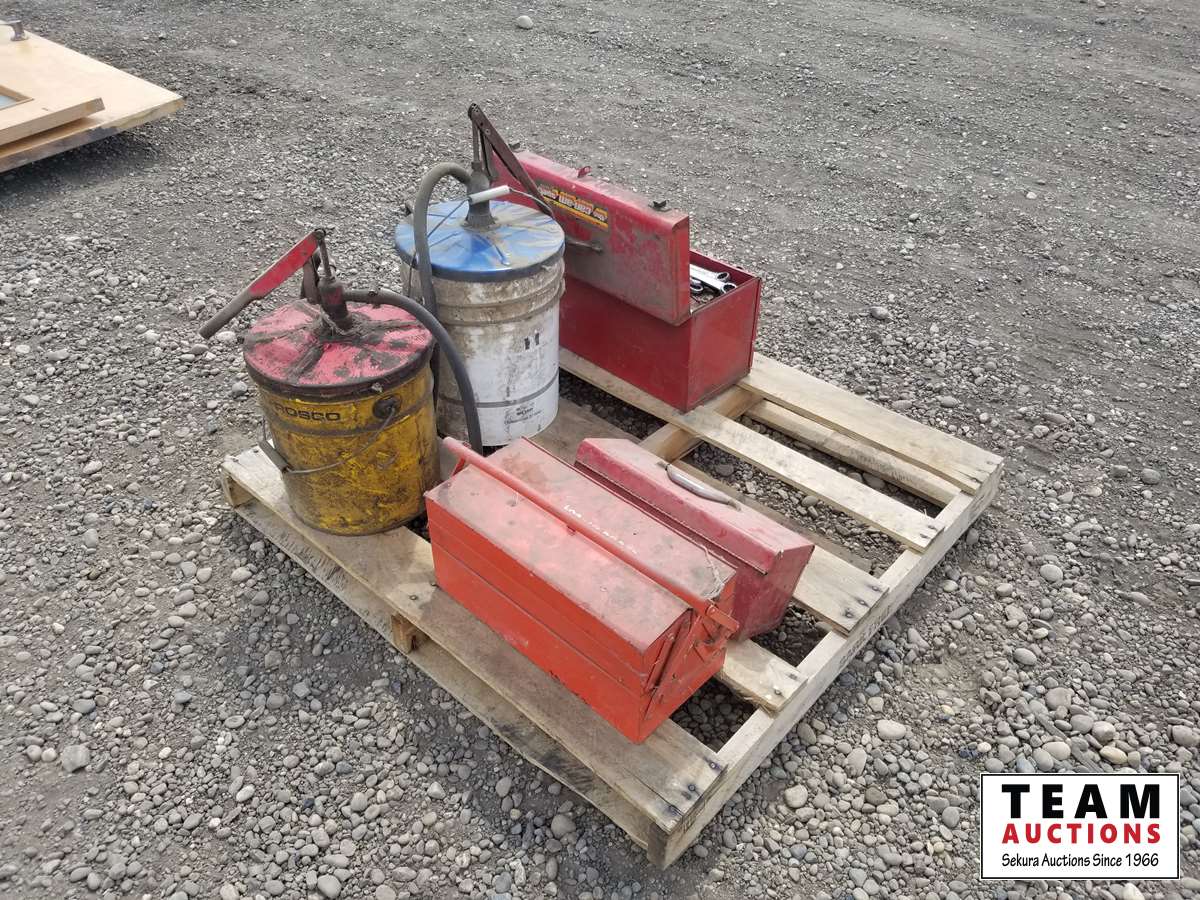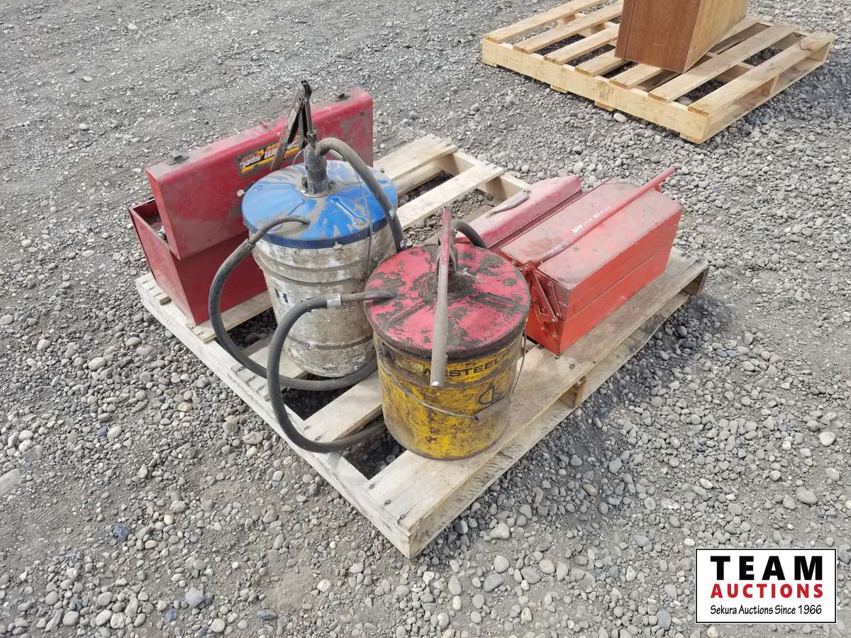 (2) oil pump pails, (3) small tool boxes & assorted tools in one of them