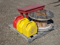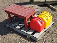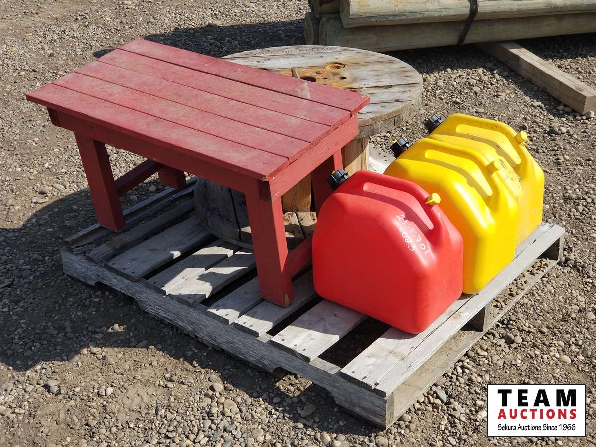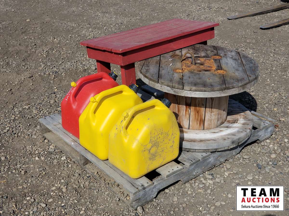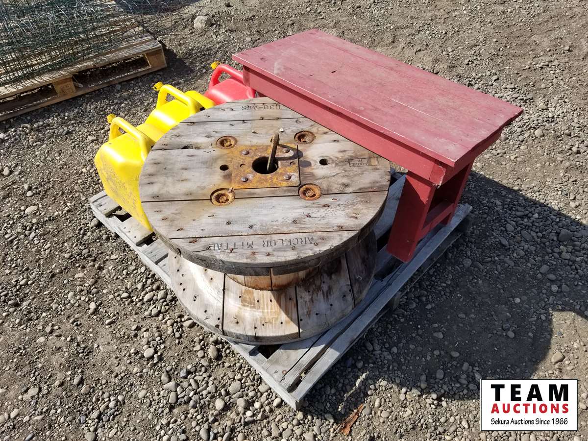 260 Wooden Spool, Table & (3) Jerry Cans