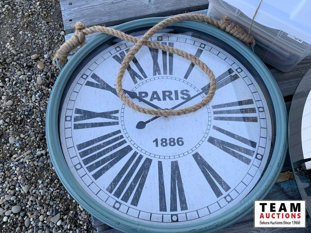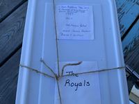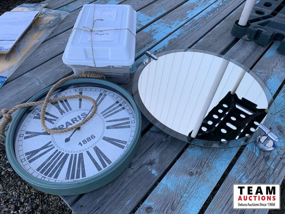 84 Clock, Tilting Mirror, Plastic Tote Containing the Royals (Unused)