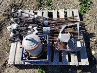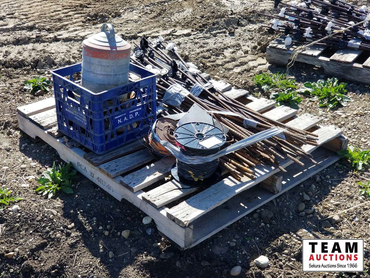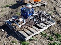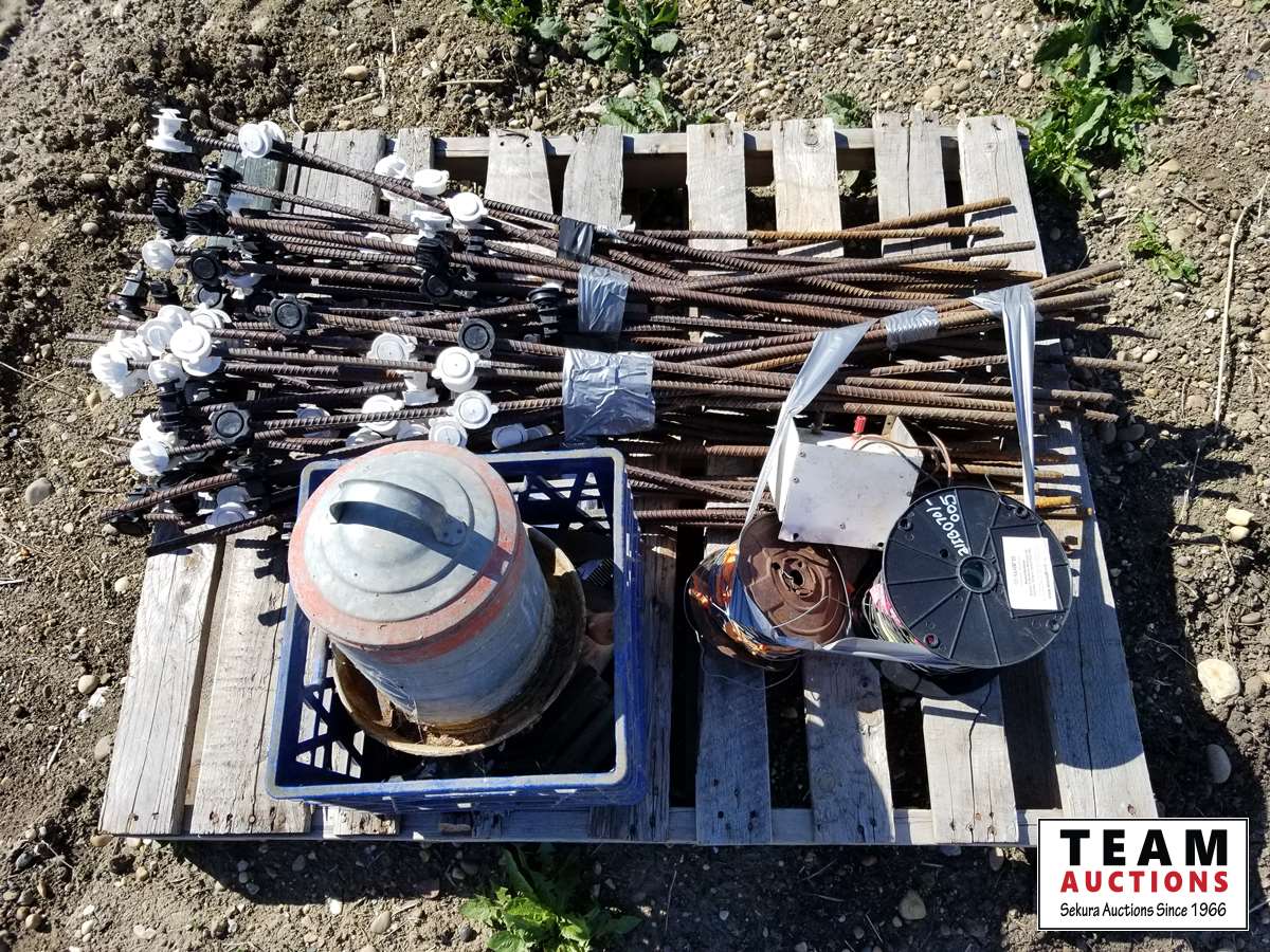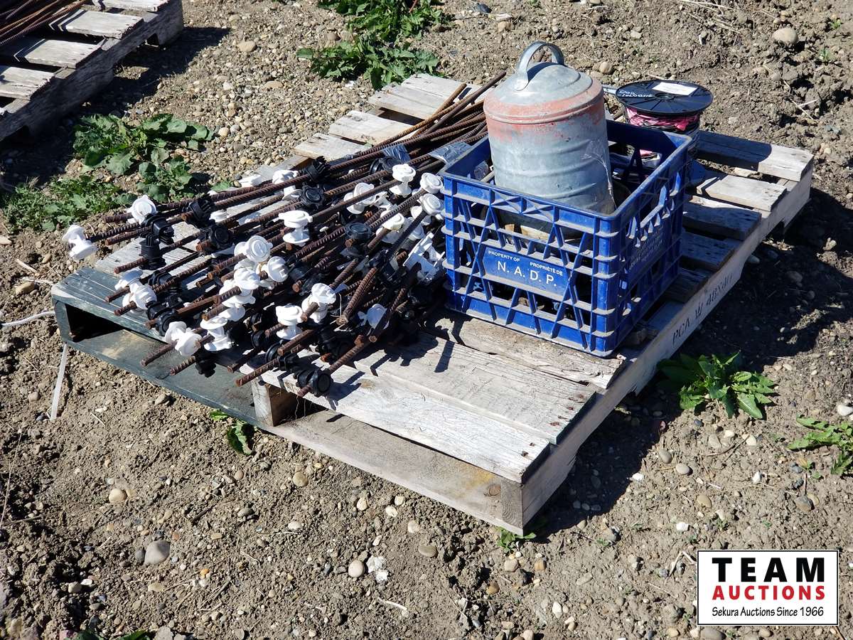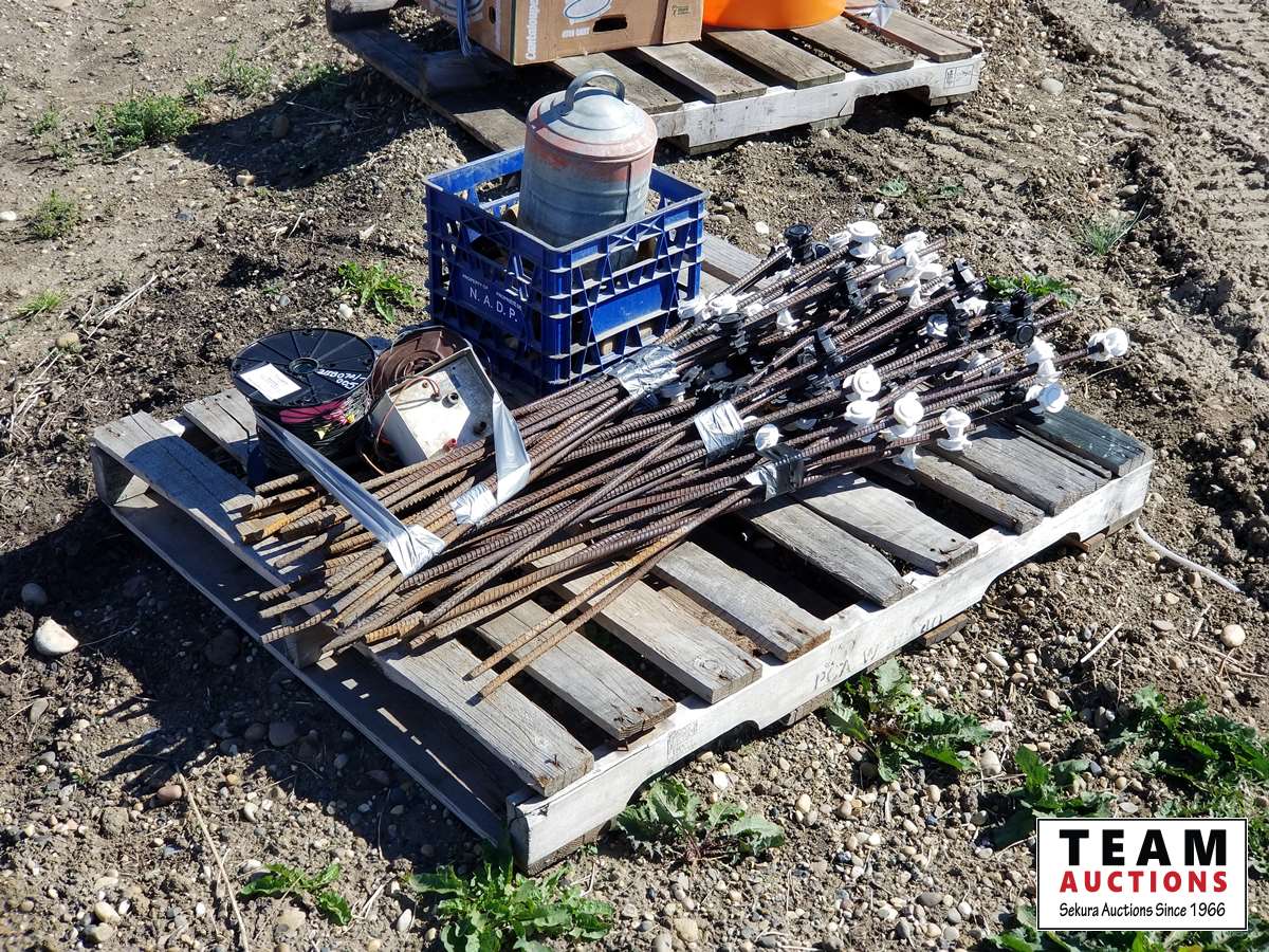 (50±) rebar with insulators, wire & cattle supplies, brushes