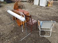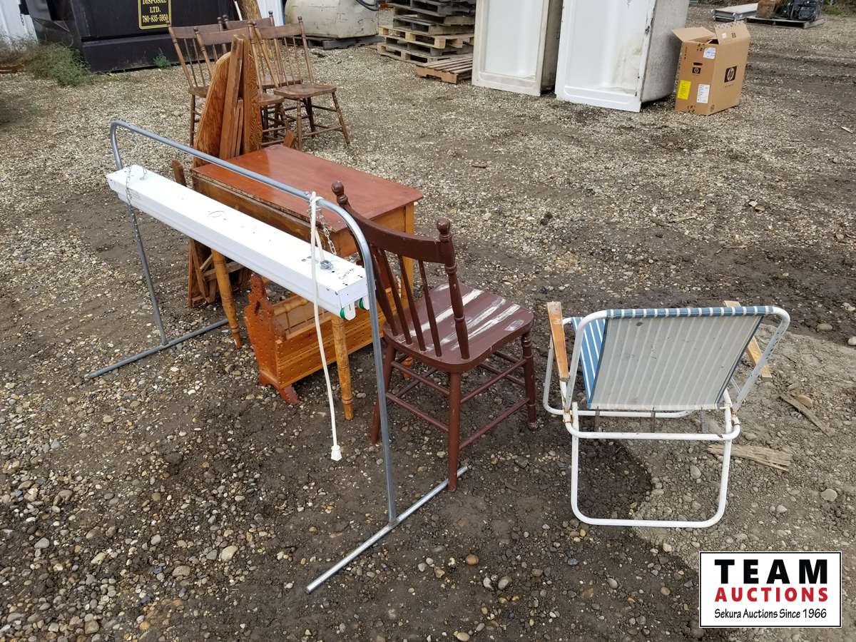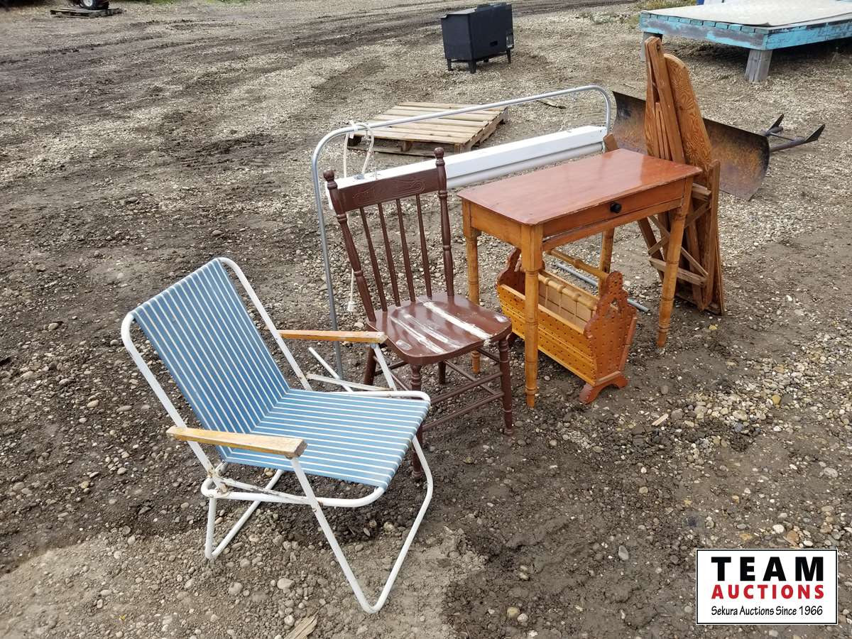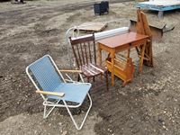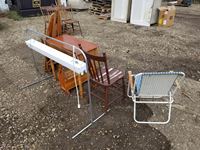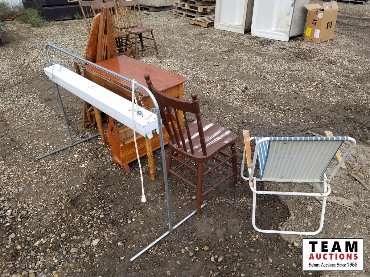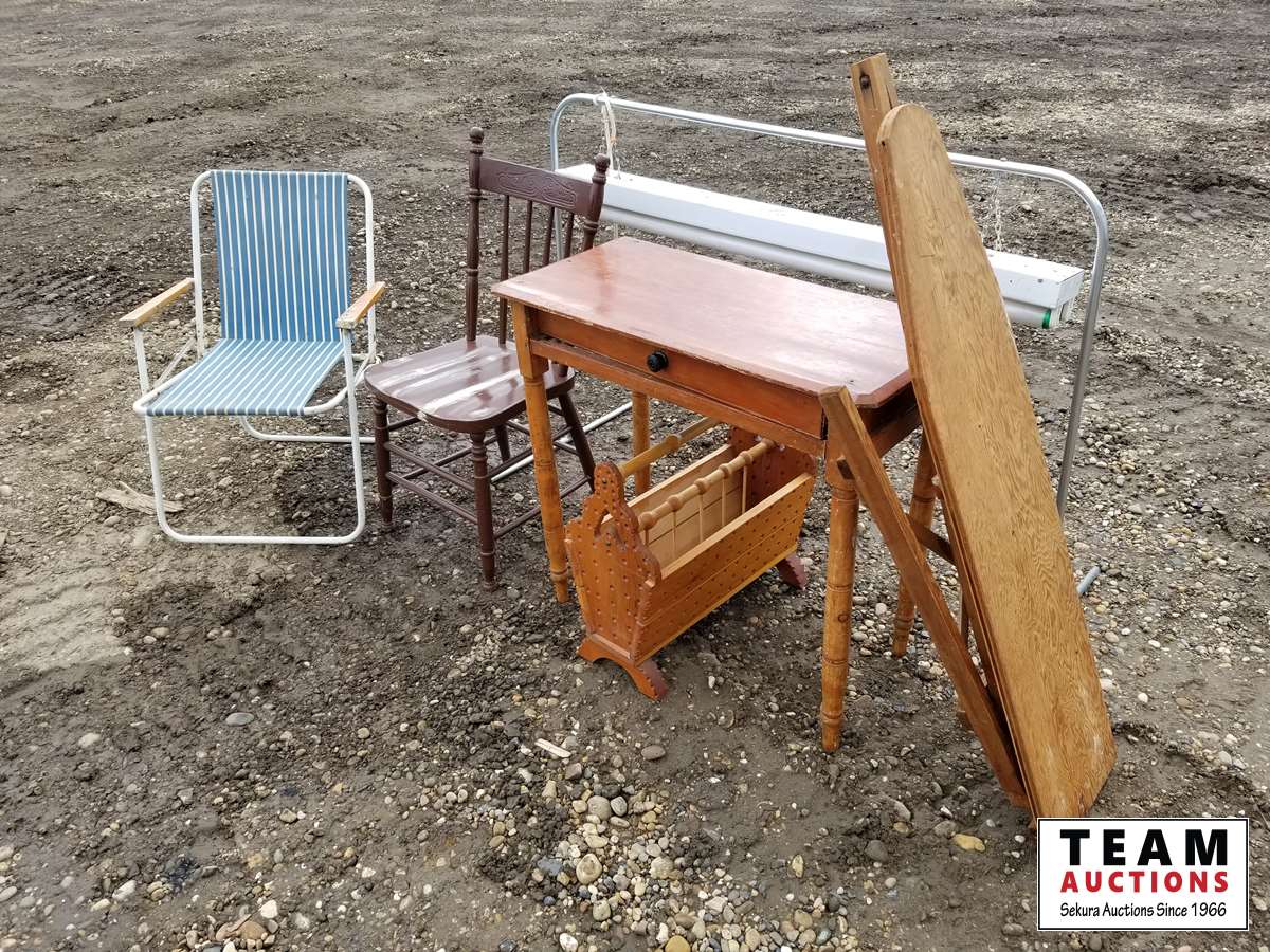 Small desk, kitchen chair, lawn chair, wooden ironing board, standing light, magazine holder
