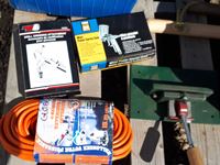 Waste oil container, drill bit sharpening attachment (as new), 15 M 14/3 Extension cord (unused), pick handle (unused), 30 drawer cabinet full assorted router bits & saw blades, dado kit, tool tote with miscellaneous tools, pickaroo