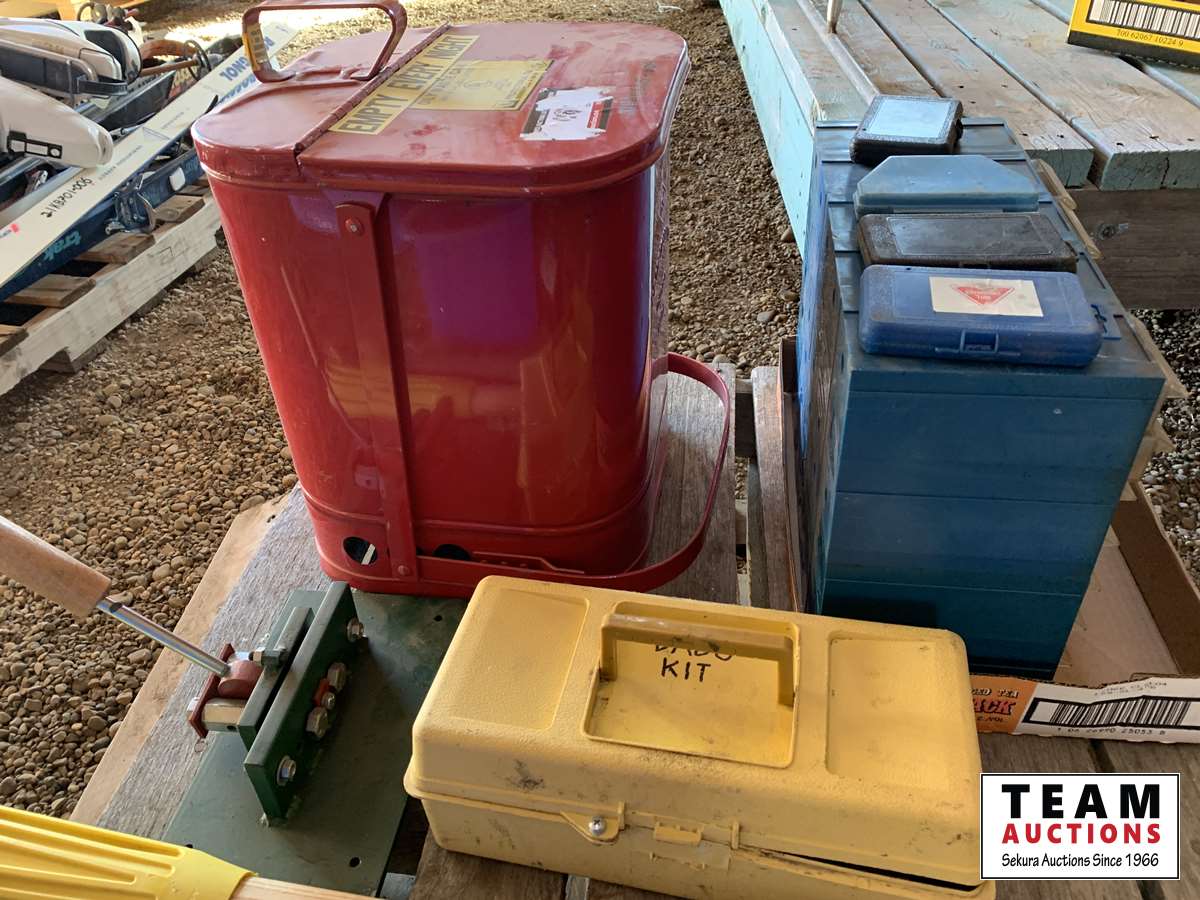 Waste oil container, drill bit sharpening attachment (as new), pick handle (unused), 30 drawer cabinet full assorted router bits & saw blades, dado kit, tool tote with miscellaneous tools, pick
