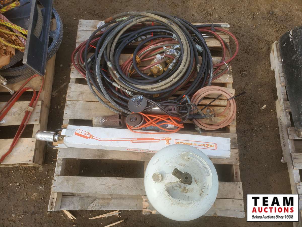 2 tiger torches, 100' of acetylene hose with gauges & torch, 2 grinders, propane bottles, misc hydraulic hose