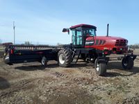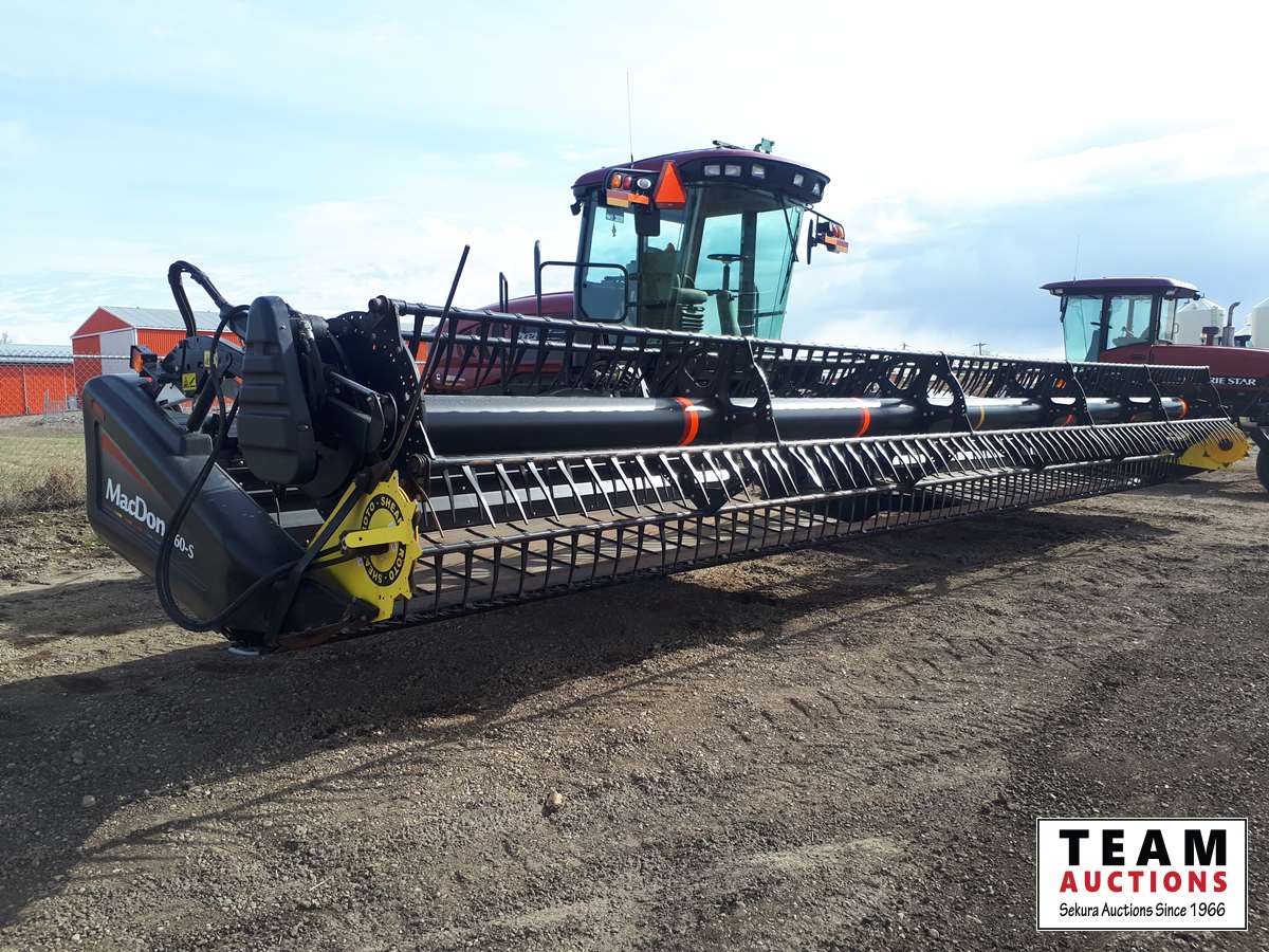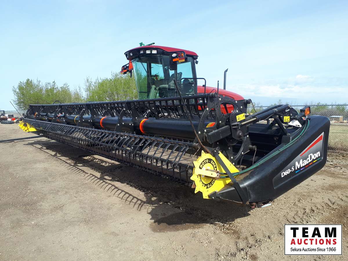 2012 Macdon D60 header, cab, air, heat, triple swath, auto heat, pick up reel, multi directional (single knife), 600/65R28 drive tires @90%, casters @ 90%, roto shears, 900hrs+/-, rates 9 out of 10
