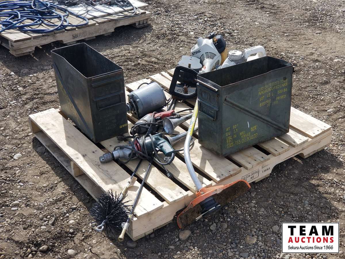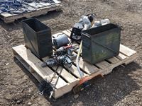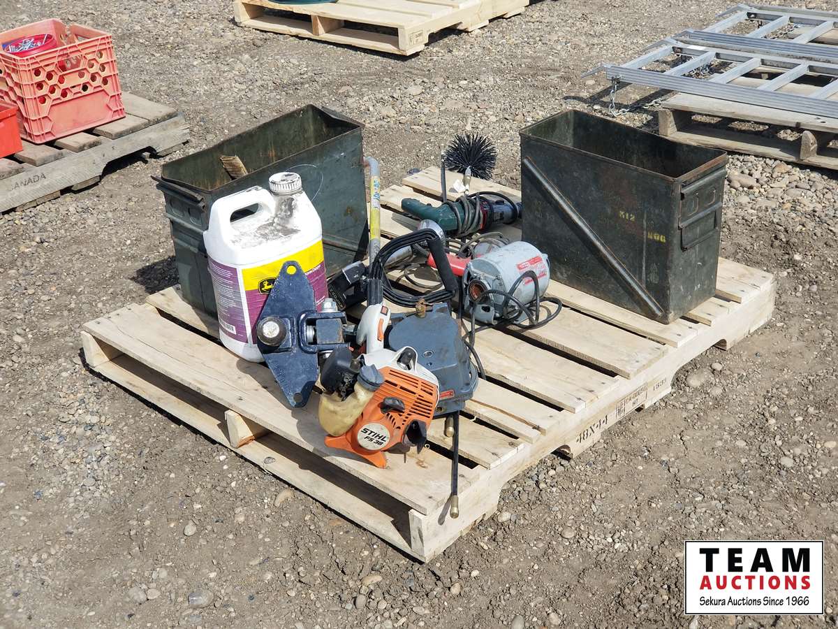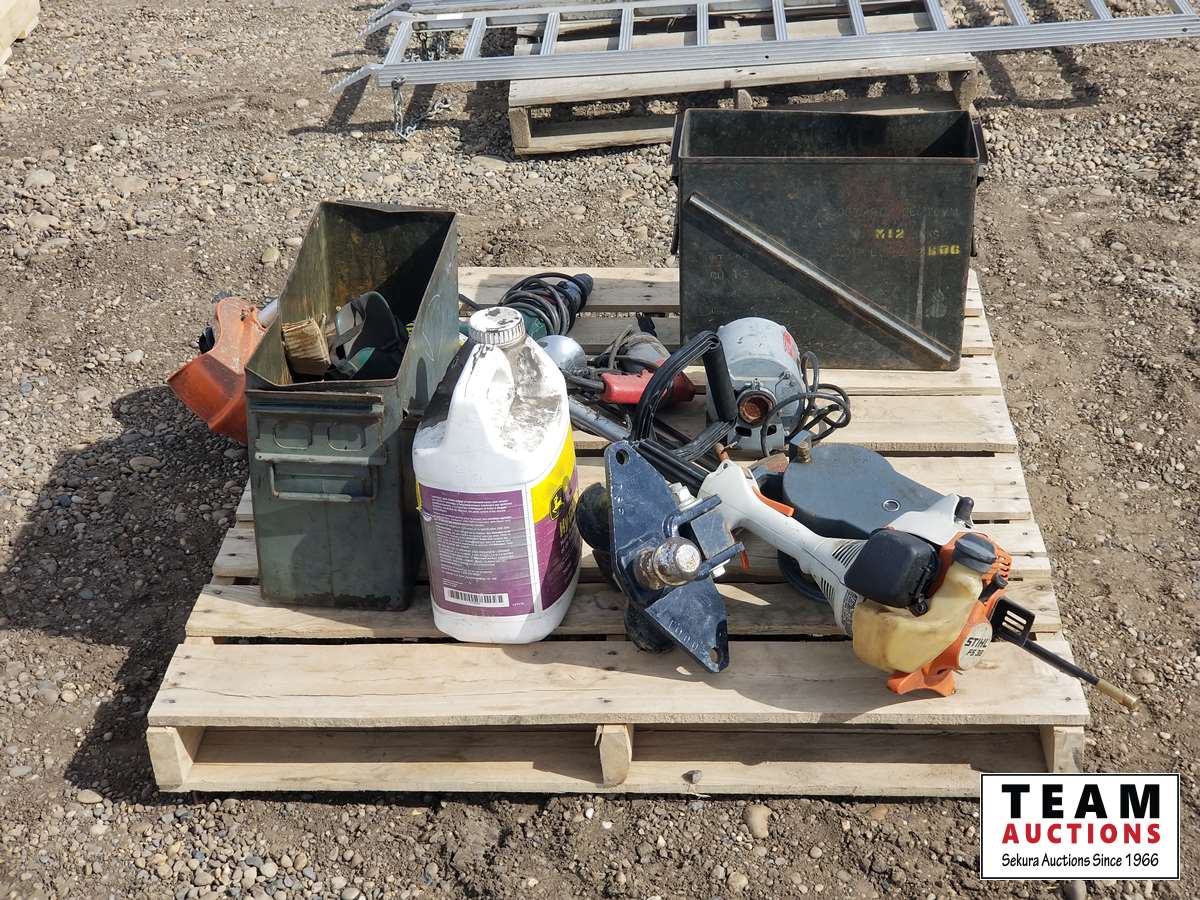128 Pallet of Electric Motors, Weed Wacker, Ball Hitch, Oil & Misc