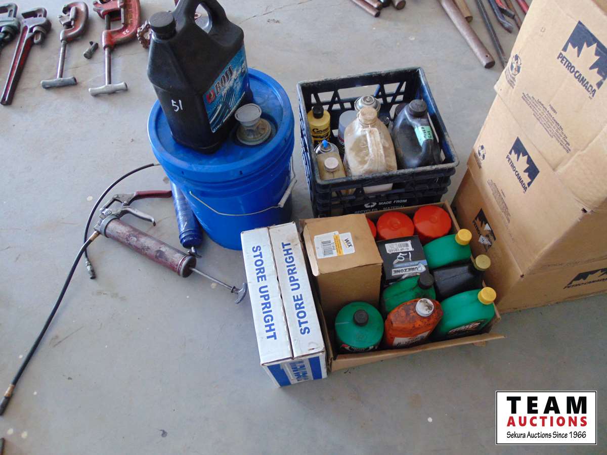 47 Assortment of Unused Oils & (2) Grease Guns