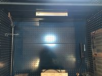 peg board, roll shutter, lights