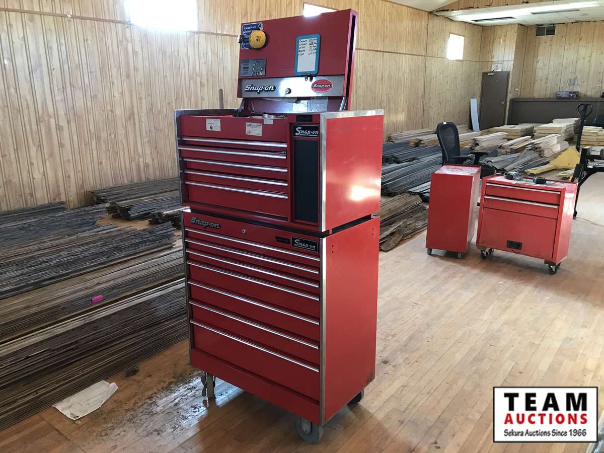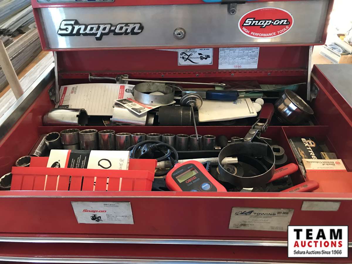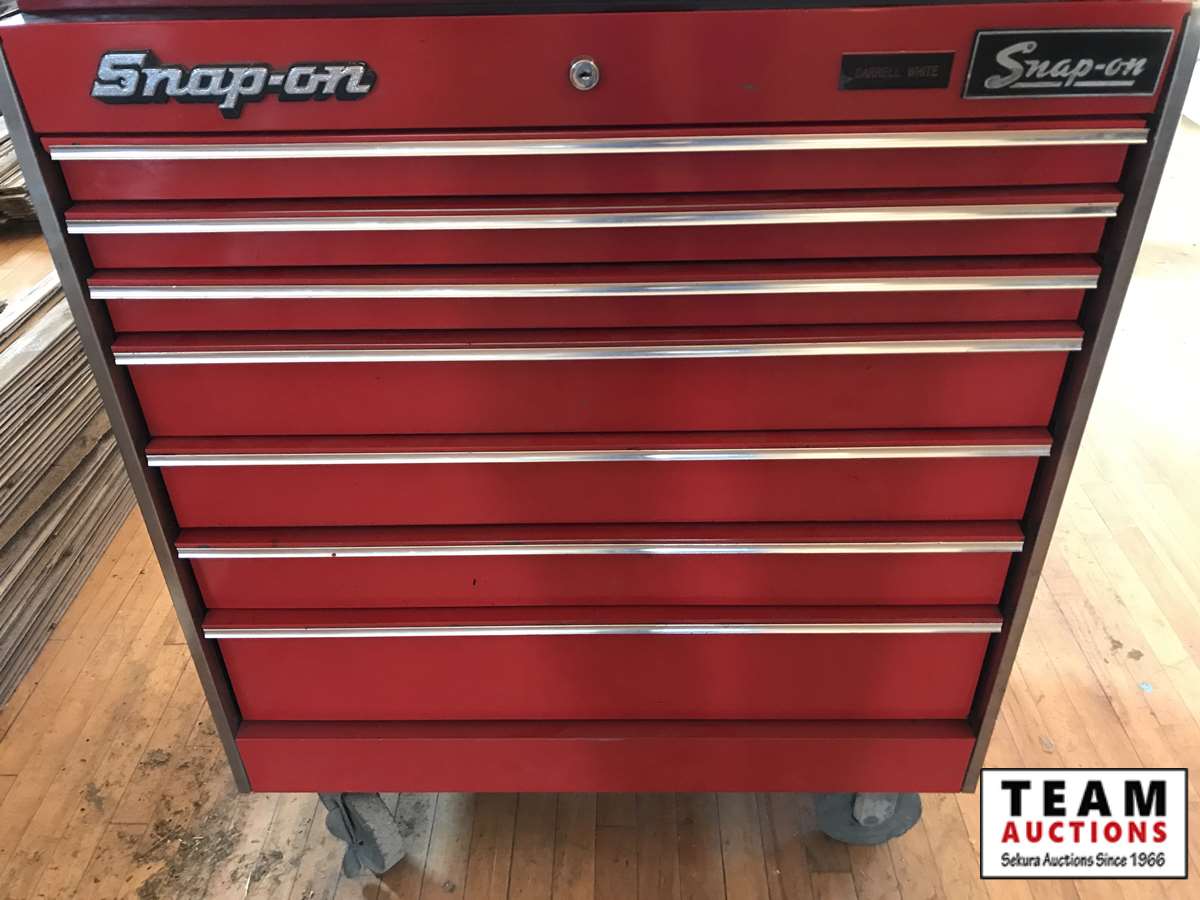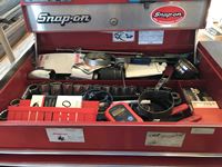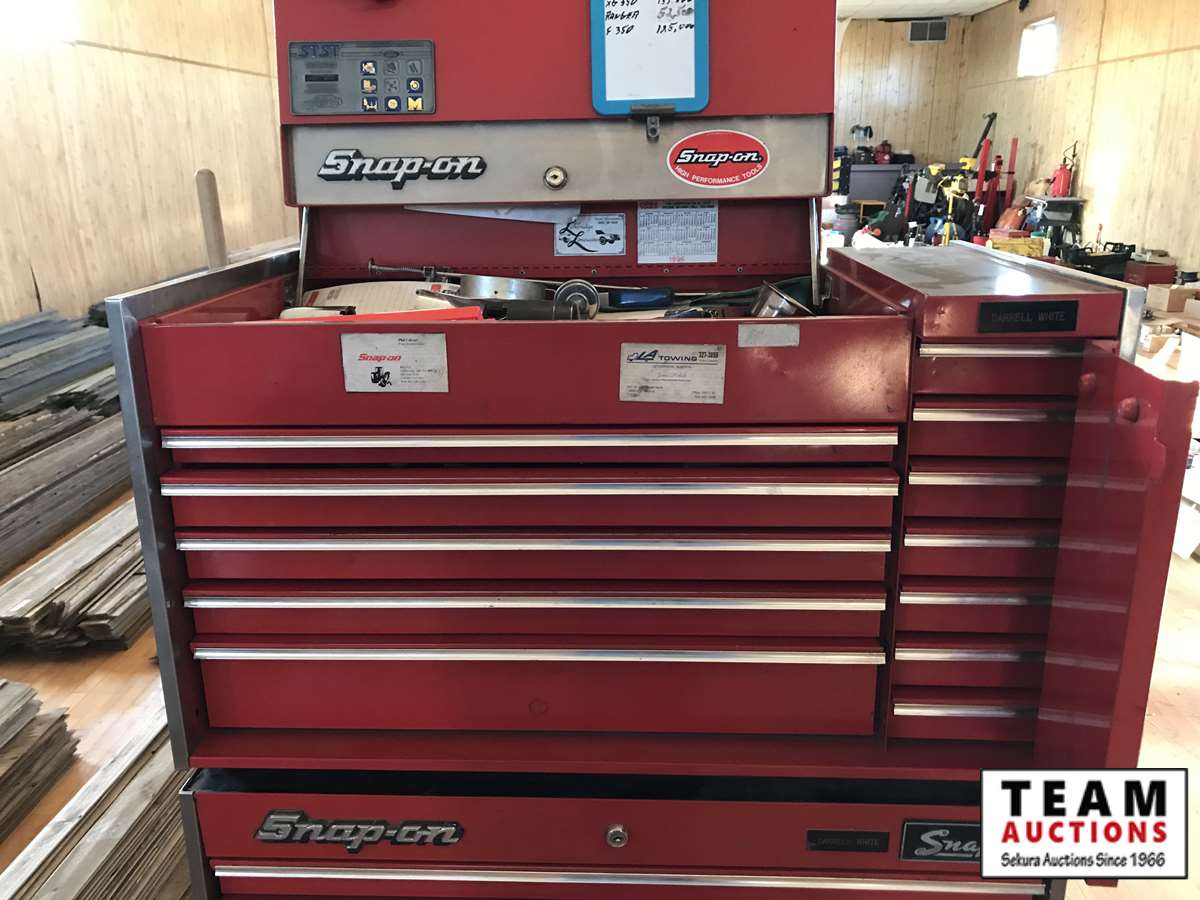 12 draw top cabinet, 7 draw bottom cabinet, Snap-on, MAC and miscellaneous brands tools
