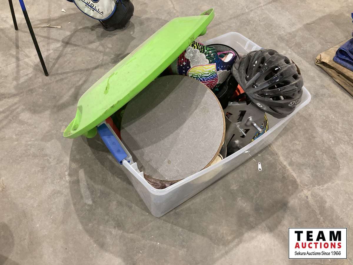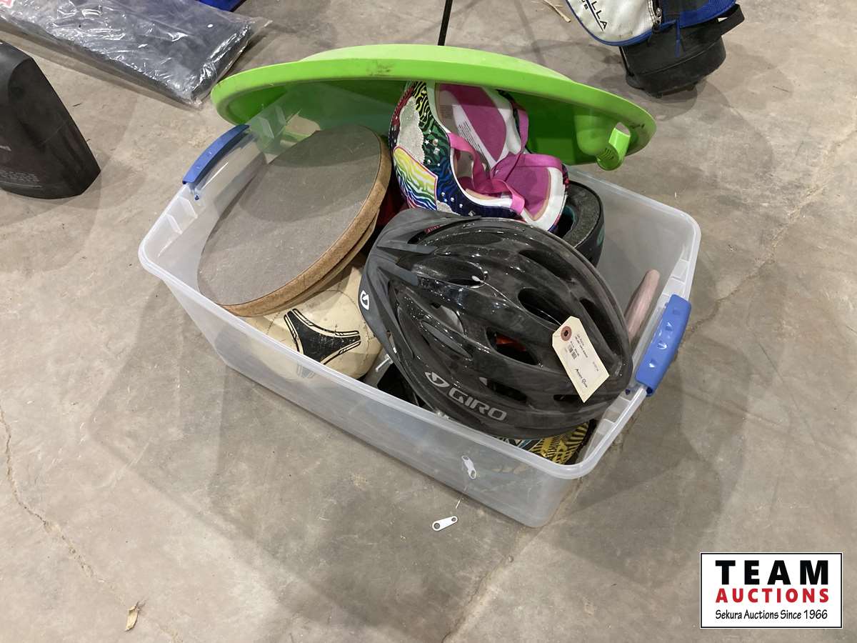bike helmets, baseball mitt, frisbee, balls