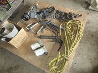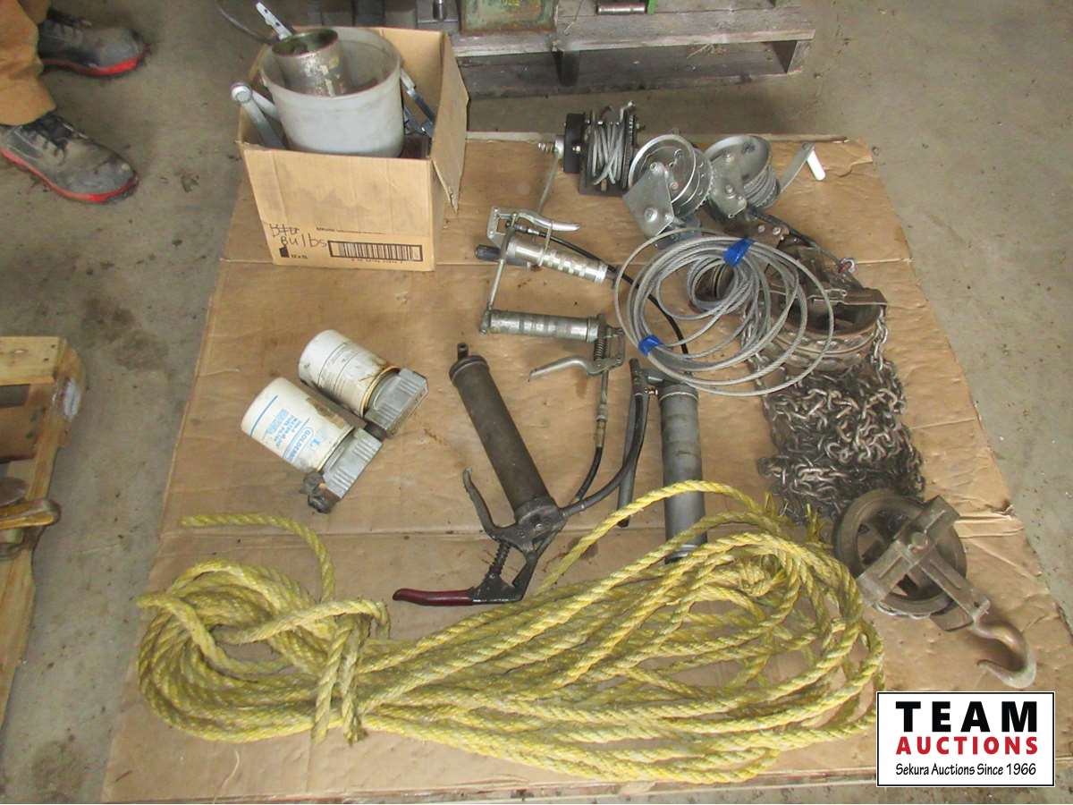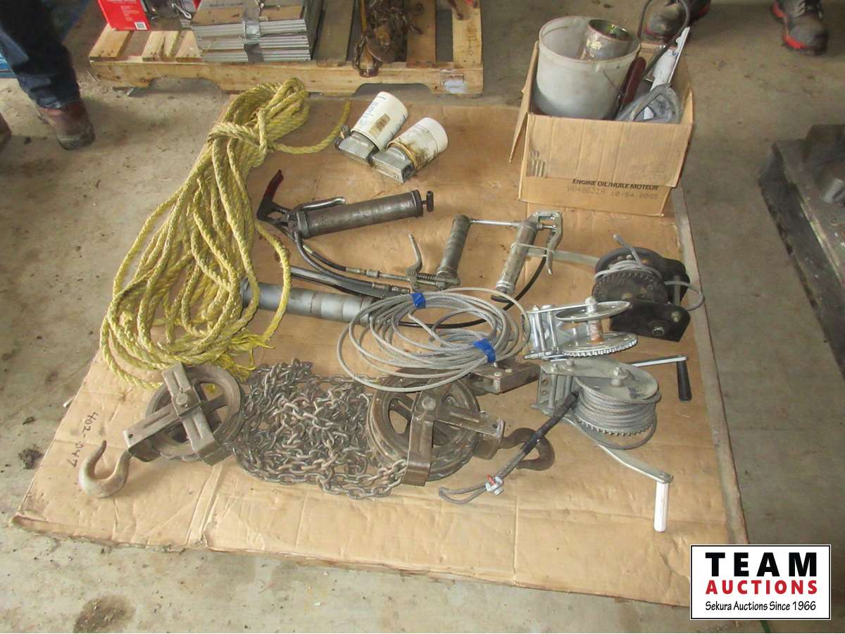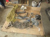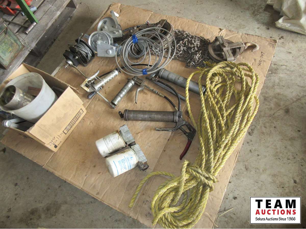chain hoist, (3) hand winches, length of rope, grease guns, misc parts, ladder hooks