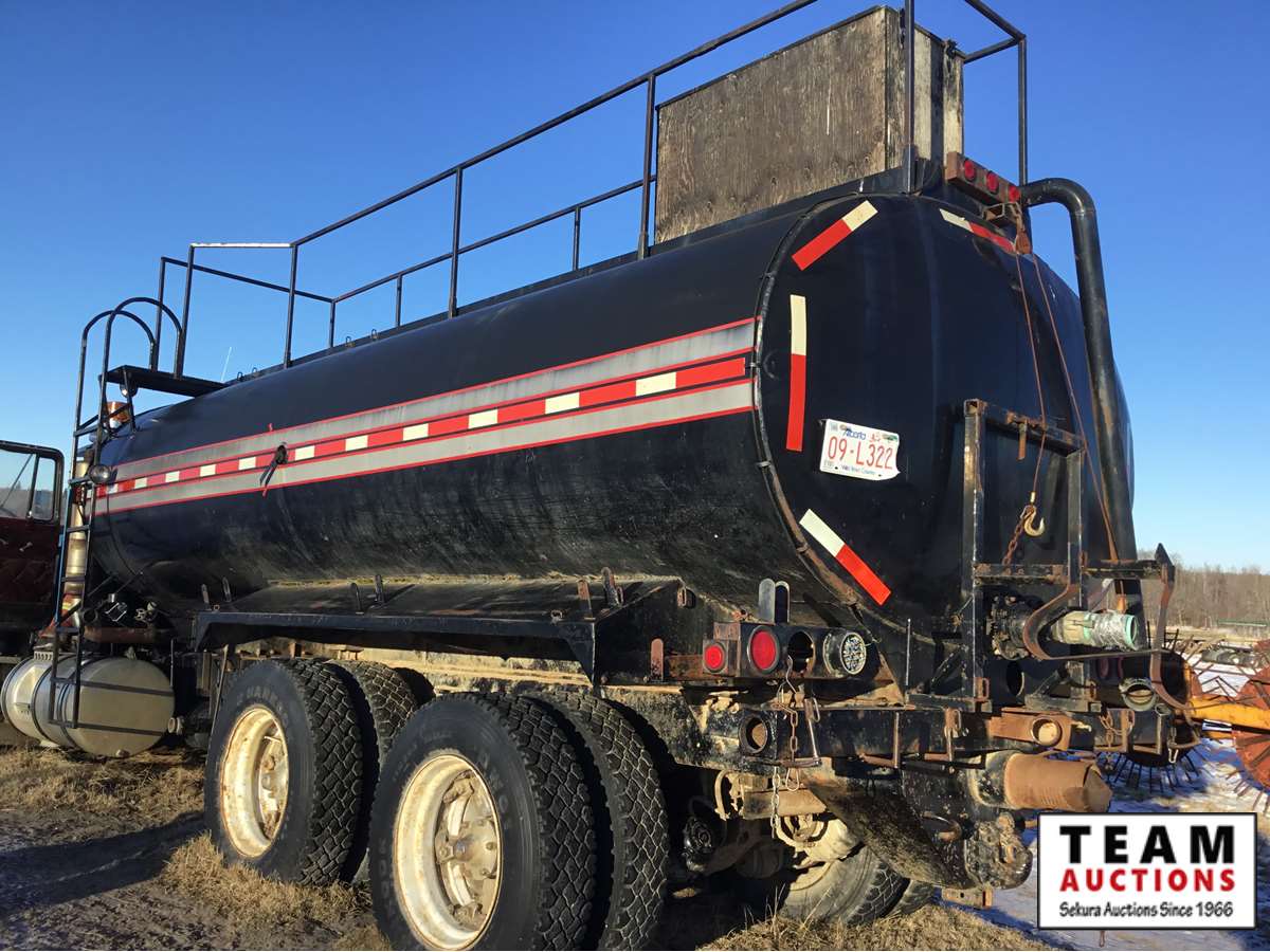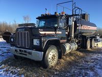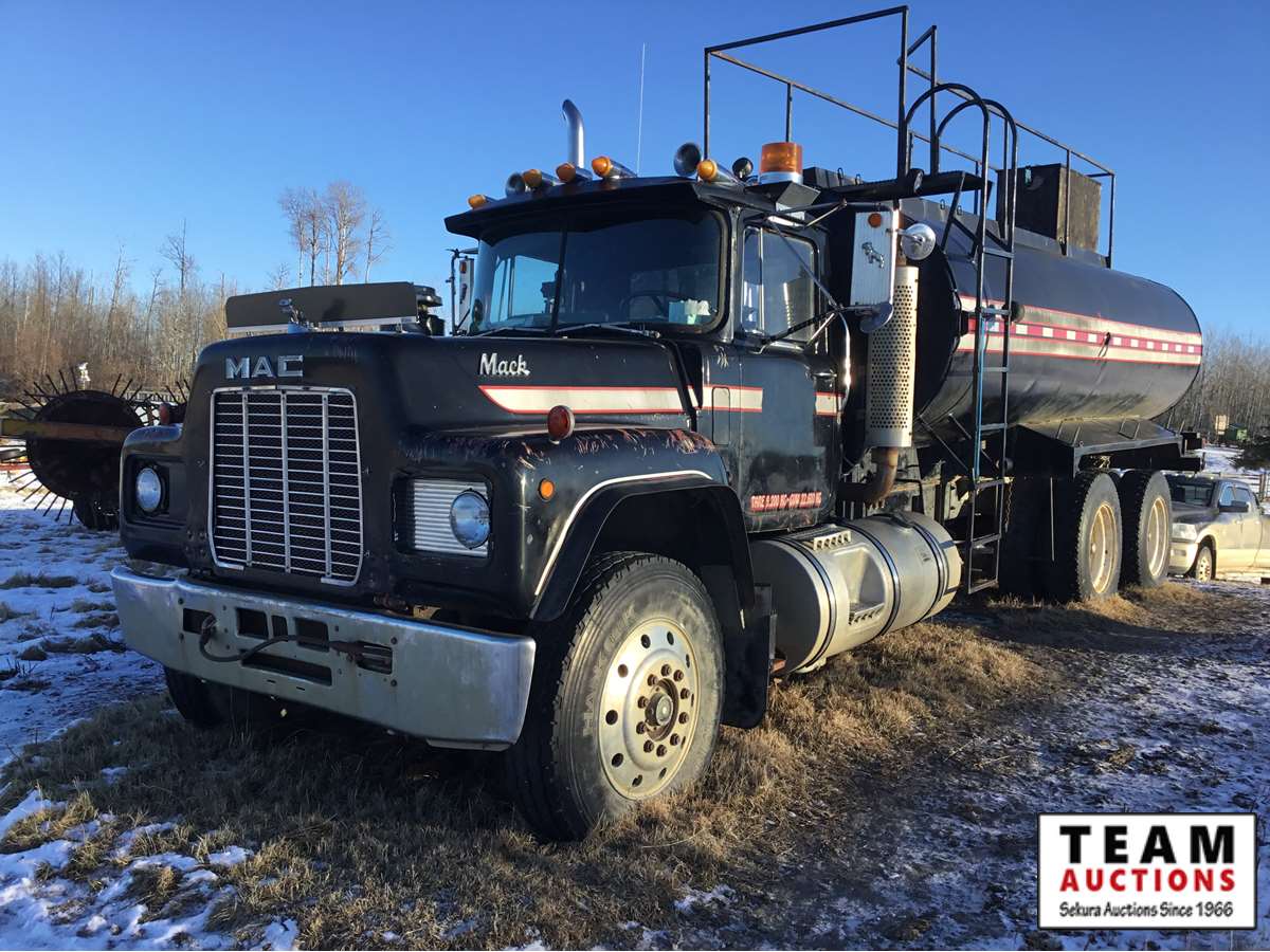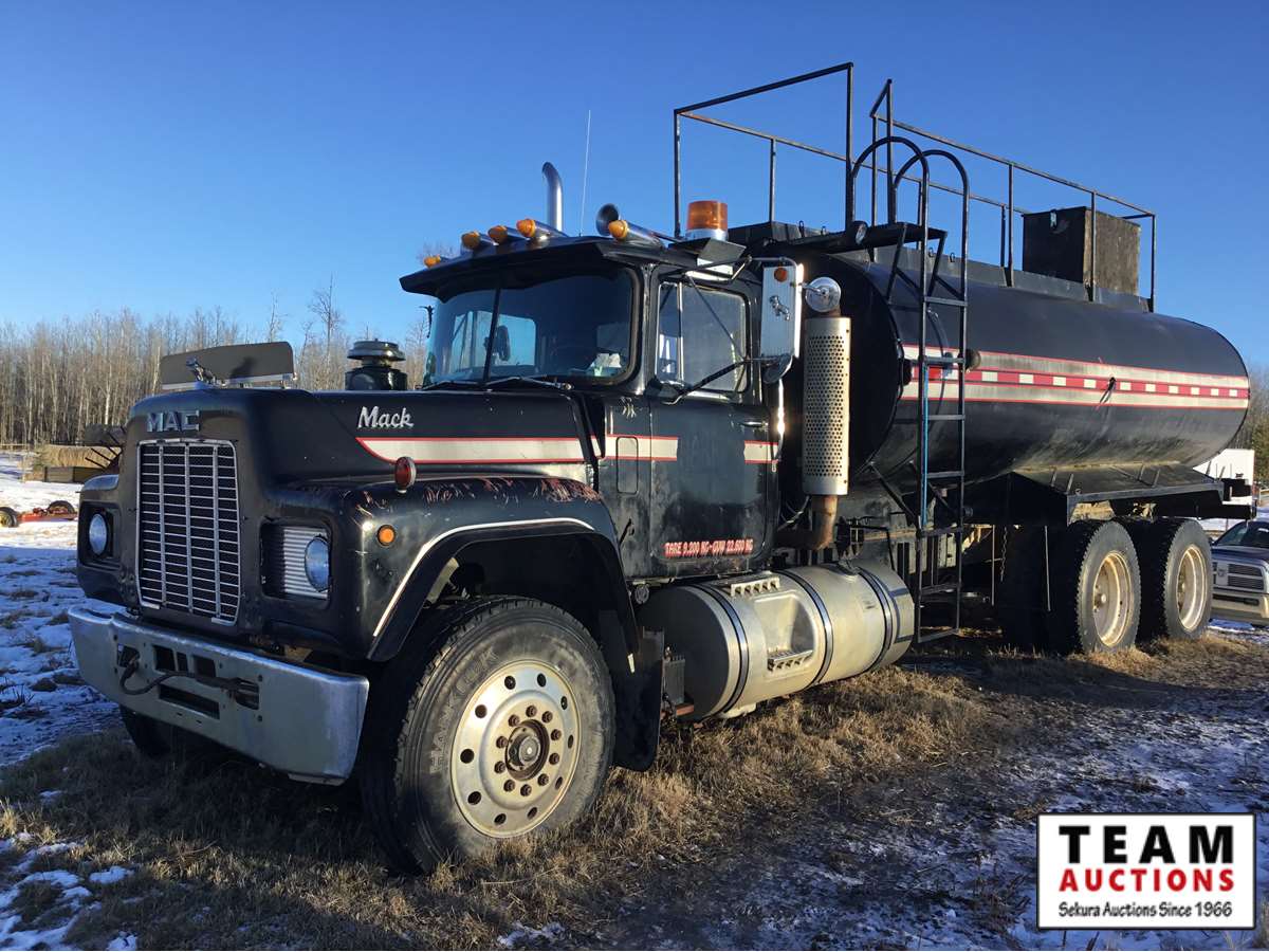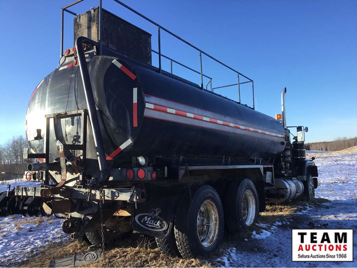 Mack 350 HP engine, Mack 18 speed transmission, Mack rears on spring suspension, water tank, pto drive pump, Alberta registered