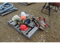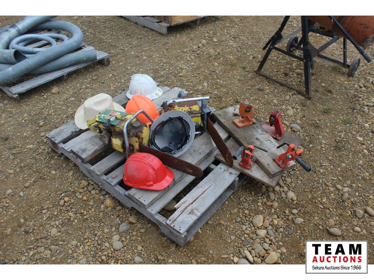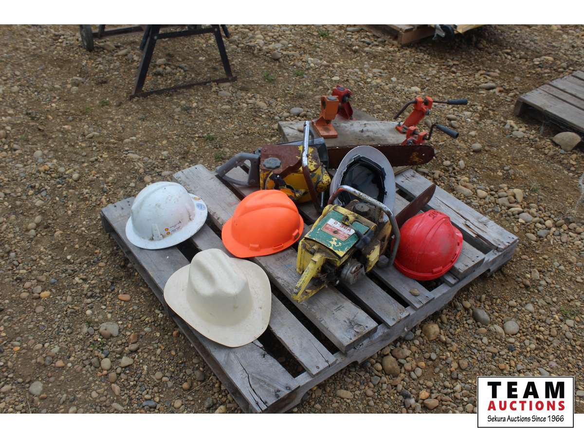 112 Pallet of (2) Antique Chainsaws & Hard Hats