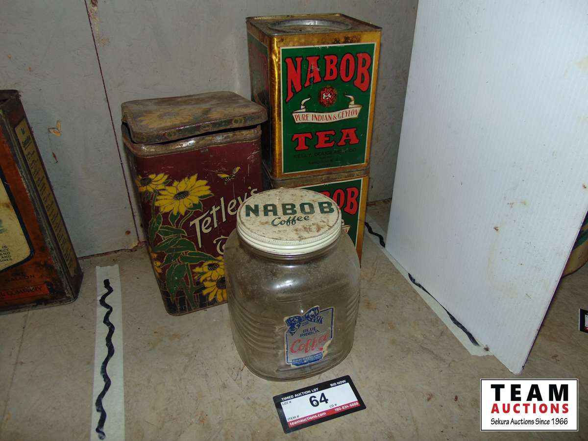 (2) Nabob 3 lbs tea tins, (1) Tetley's tea tin, Nabob coffee jar