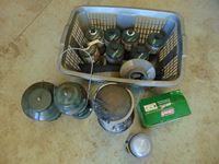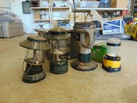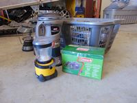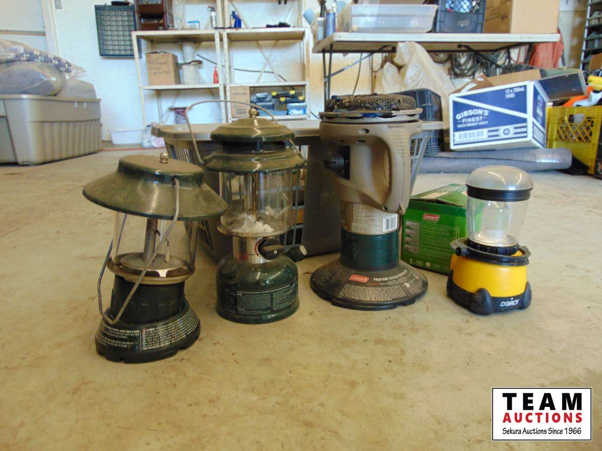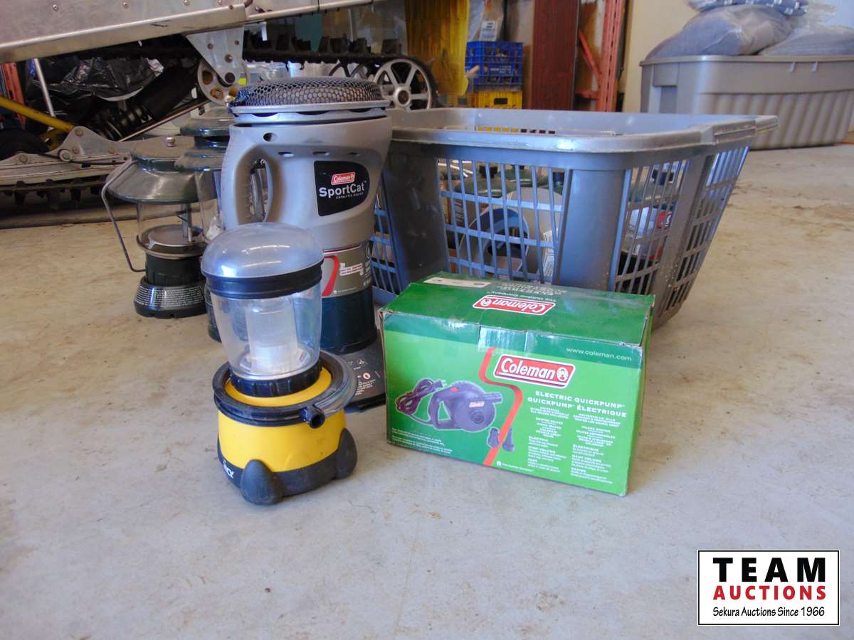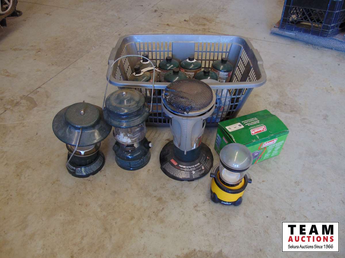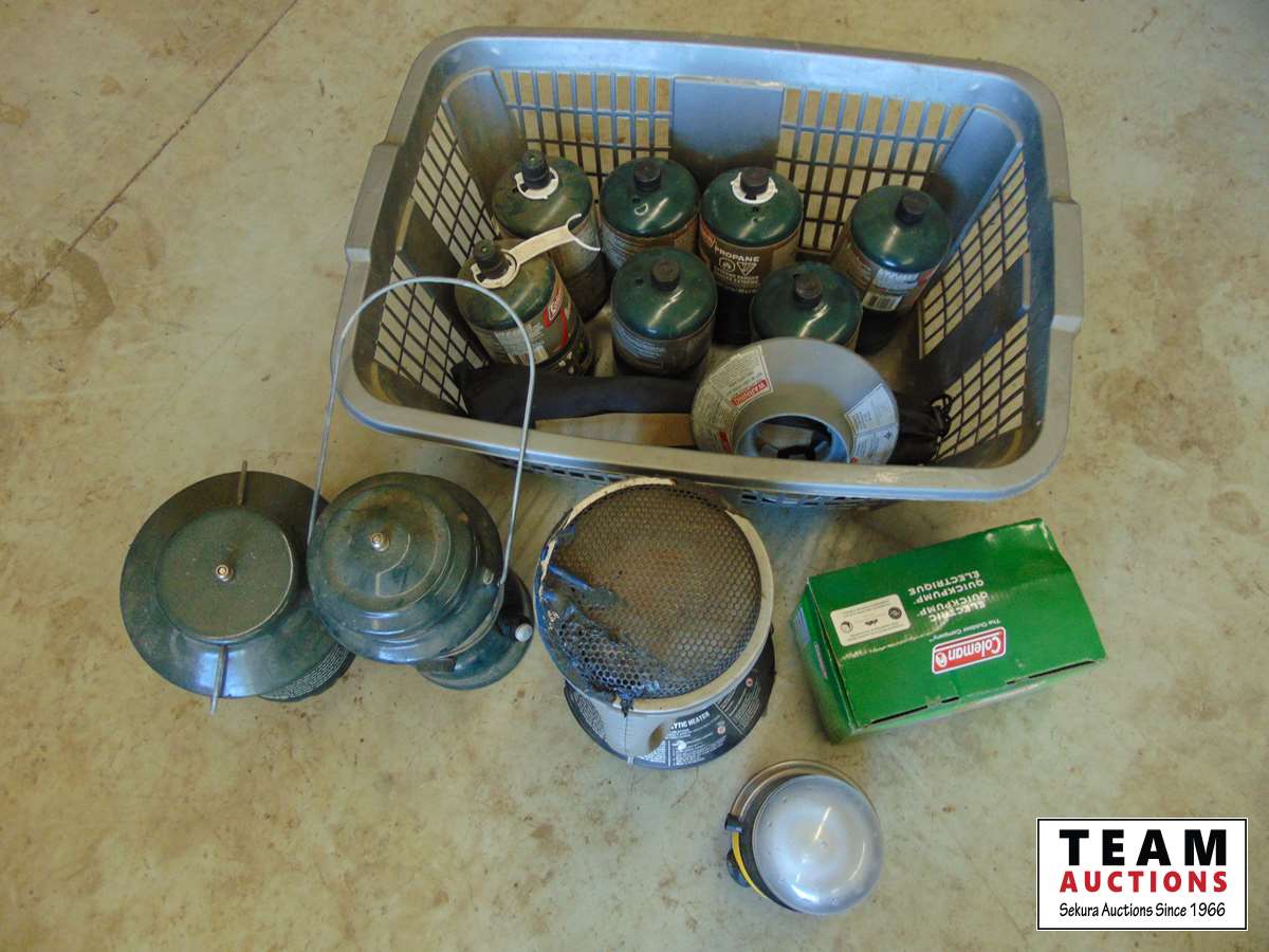 Variety of propane bottles, tent heaters, lanterns, & Coleman electric quick pump