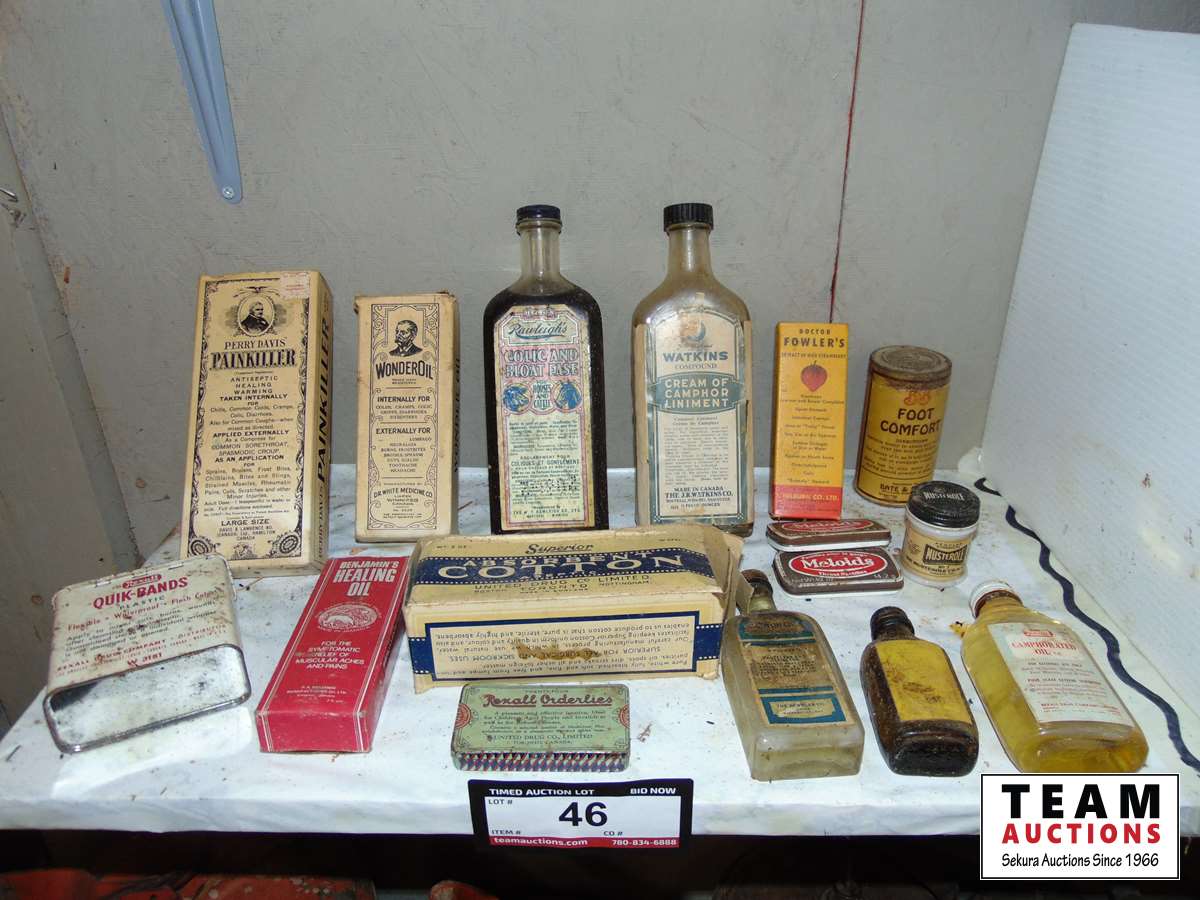 46 Miscellaneous Antique Medicine Bottles and Tins