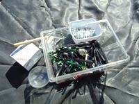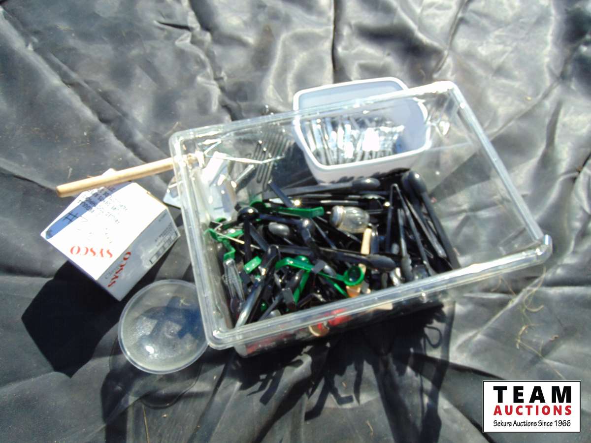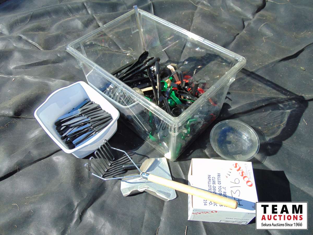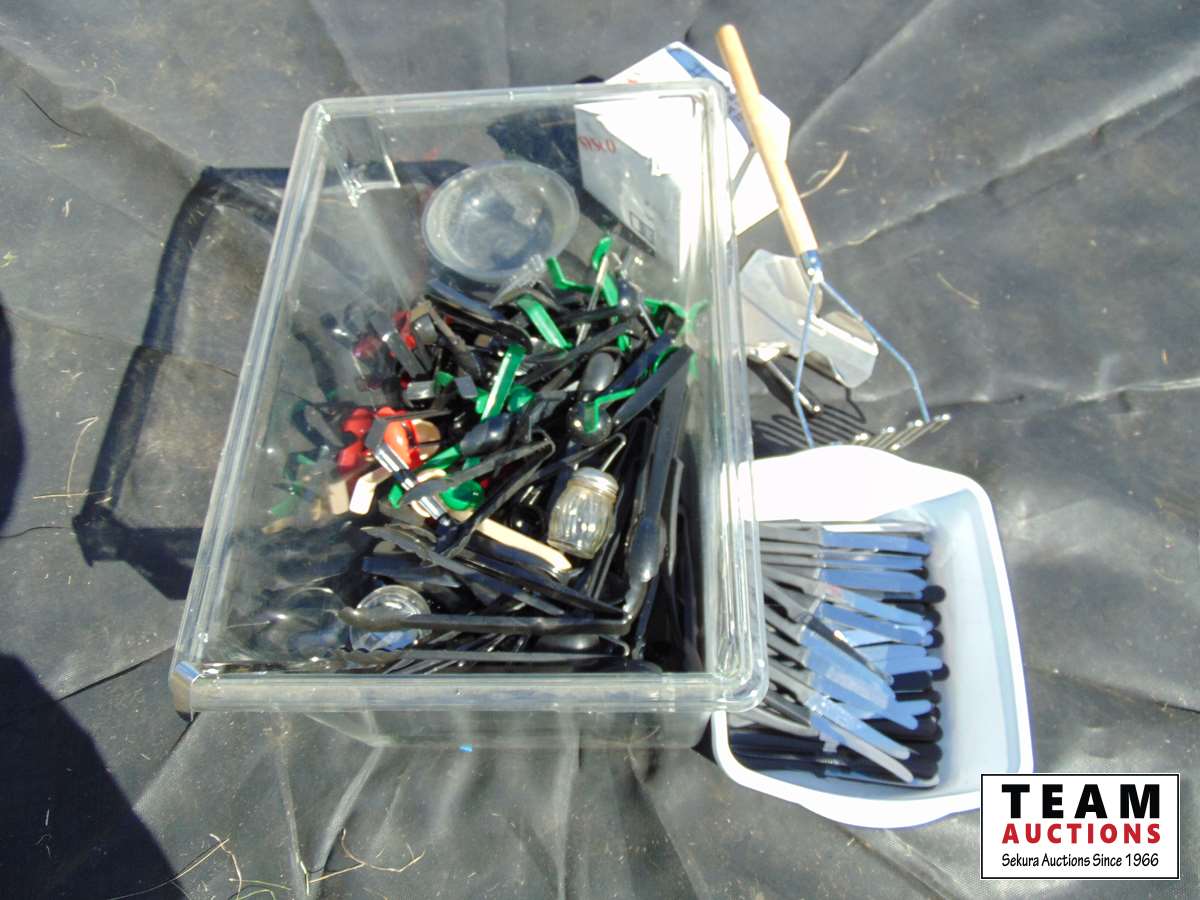 Kitchen utensils, large plastic container, large potato masher & miscellaneous