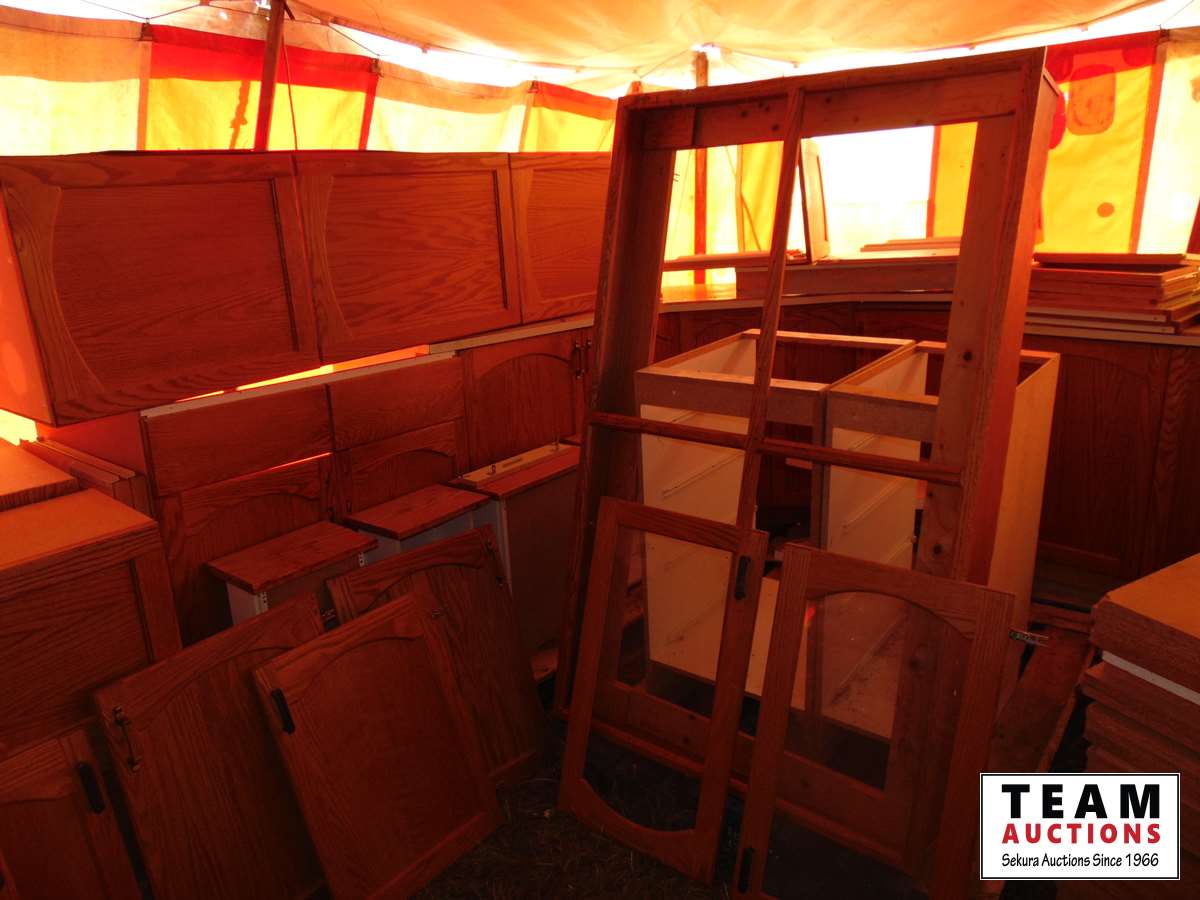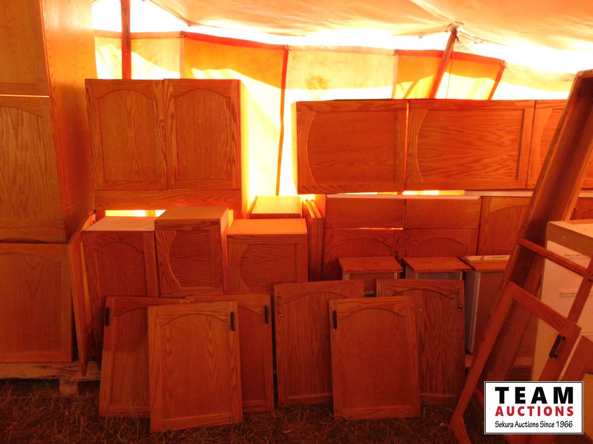 The kitchen cupboards have solid oak frame doors with oak plywood centers. The drawer fronts are solid oak. Additional glass doors that were on a China cabinet are included. The kitchen was approximately 14 ft by 15 ft plus two island sections. A counter top cooktop and double sink are included.