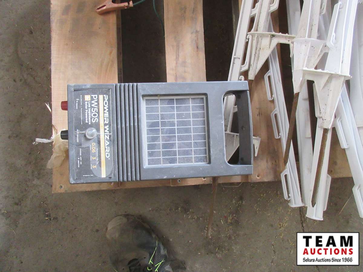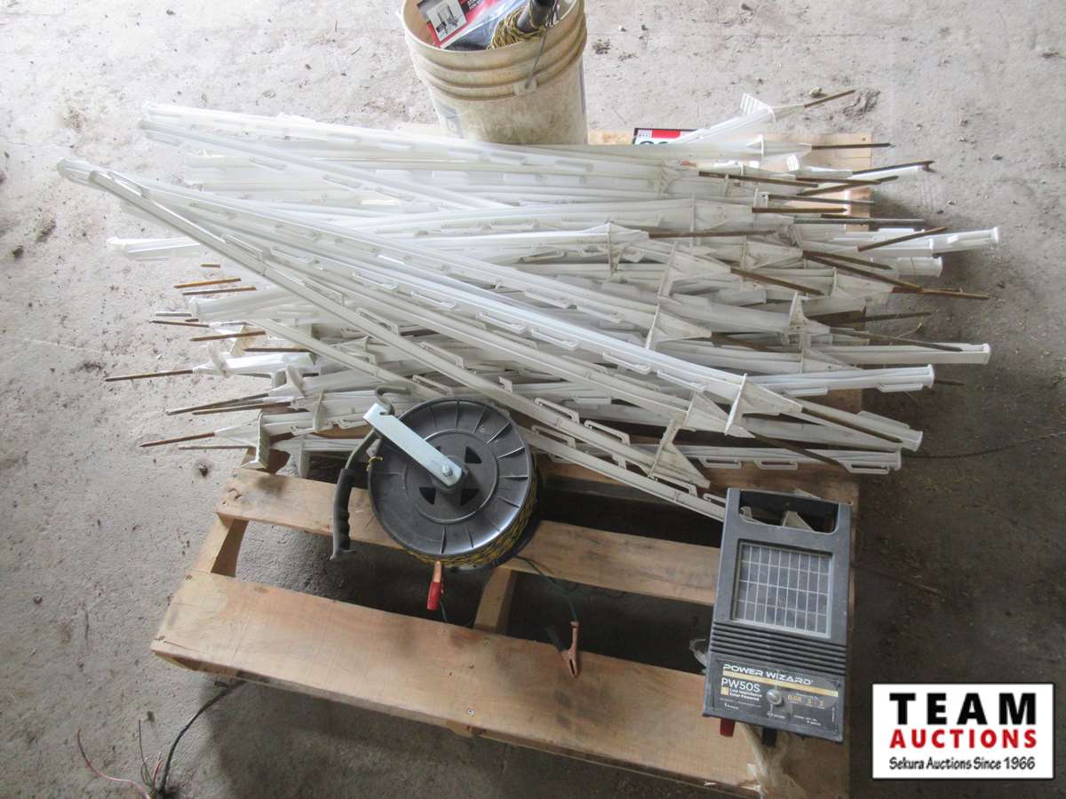 Power Wizard electric fencer, (45±) poly electric fence pickets, wire, insulators
