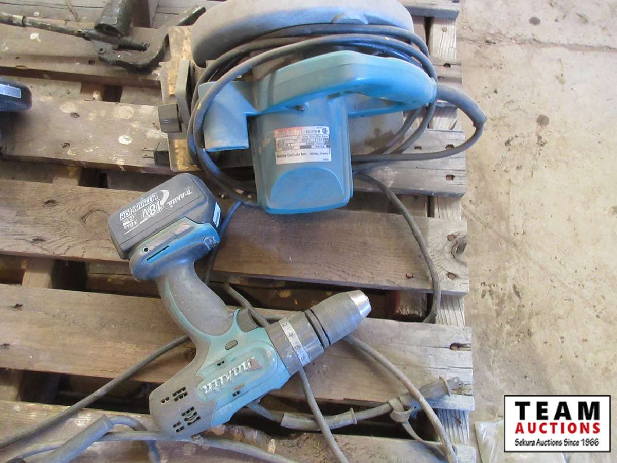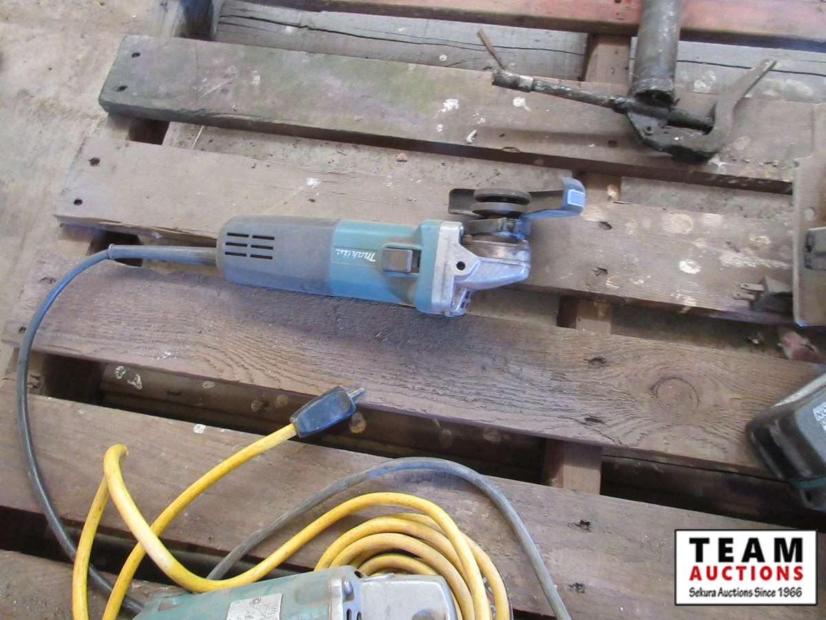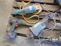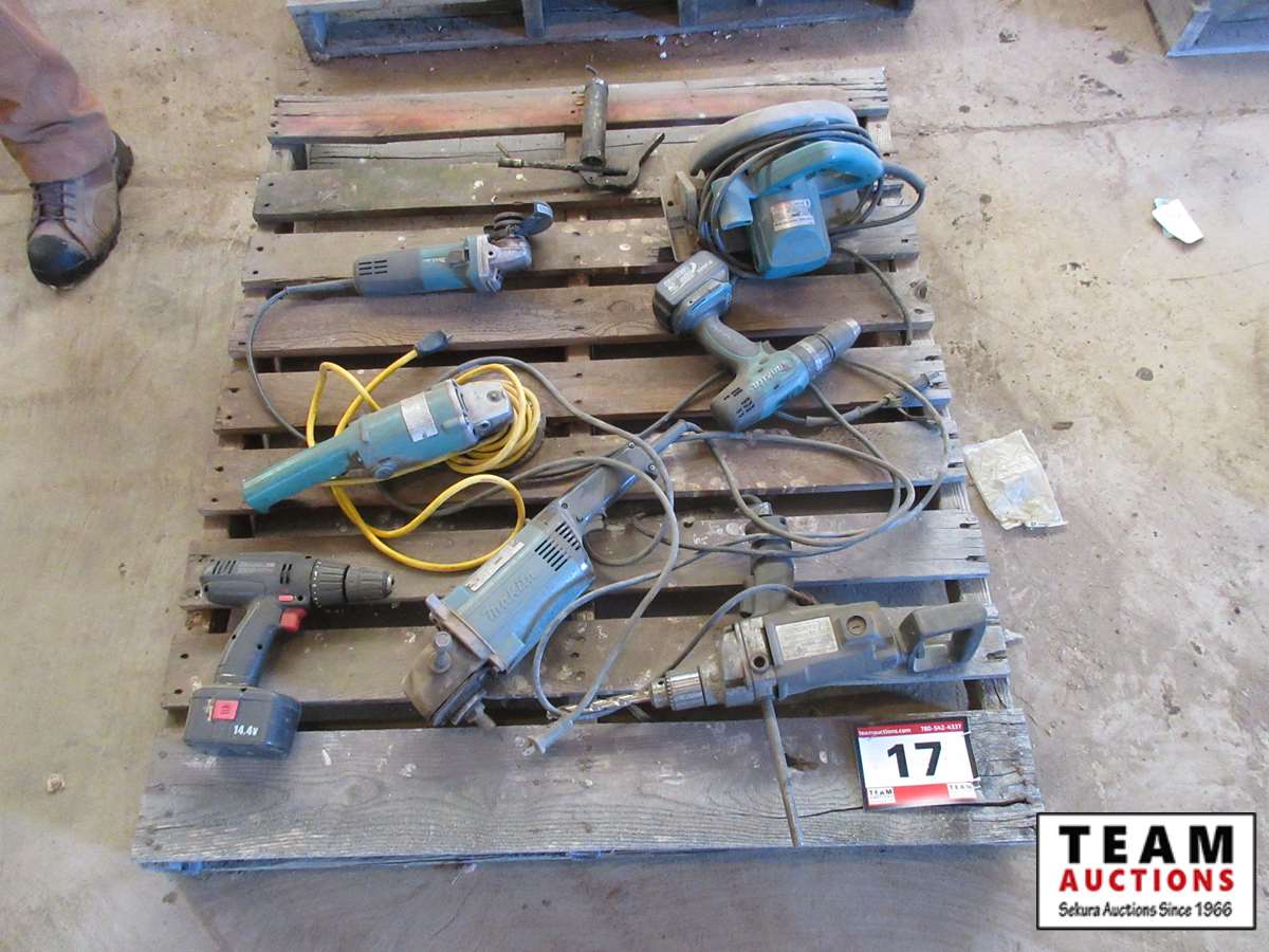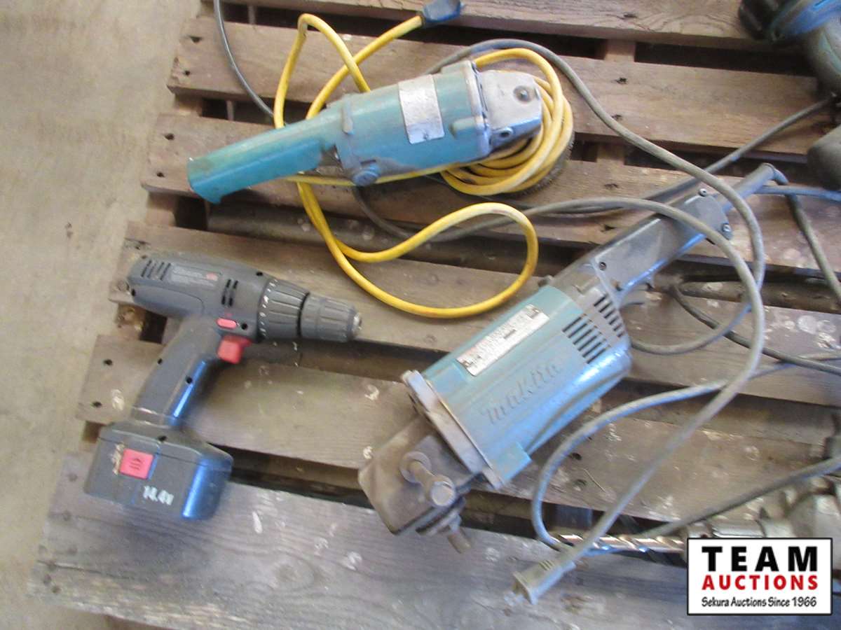 7 1/4" Skil saw, Makita 3/8 drill, B&D 1/2" drill, Makita 7" grinder, Jobmate 3/8 14.4 V cordless drill, (2) Makita 4.5" grinders, mini grease gun