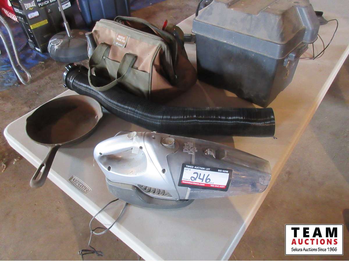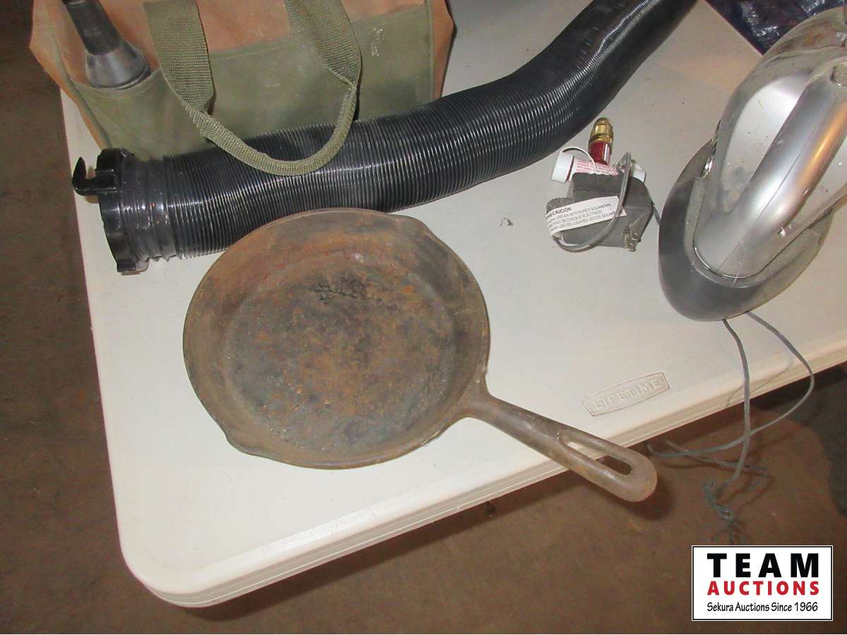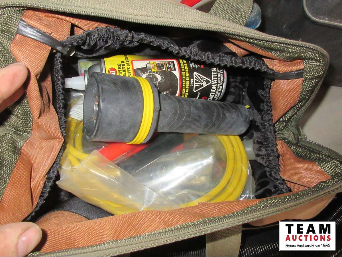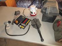 camping supplies, battery box, vacuum, hatchet, folding shovel, road side kit
