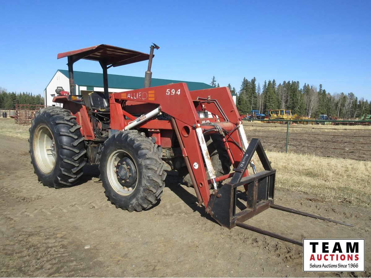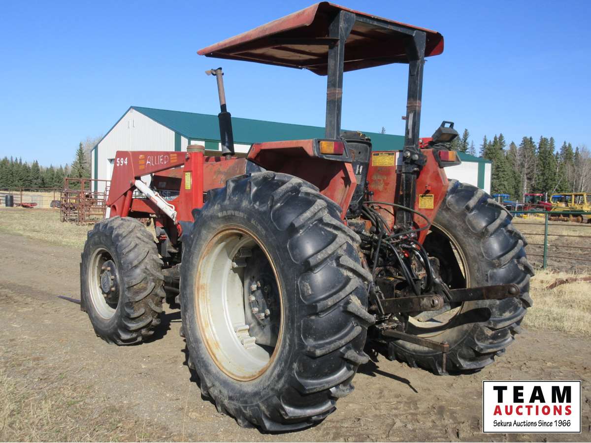 Allied loader, bale forks, 12 speed transmission, 3 Pt hitch, 540 PTO, (3) rear hydraulic outlets, roll bar with canopy, 13.6X24 front & 18.4X34 rear tires